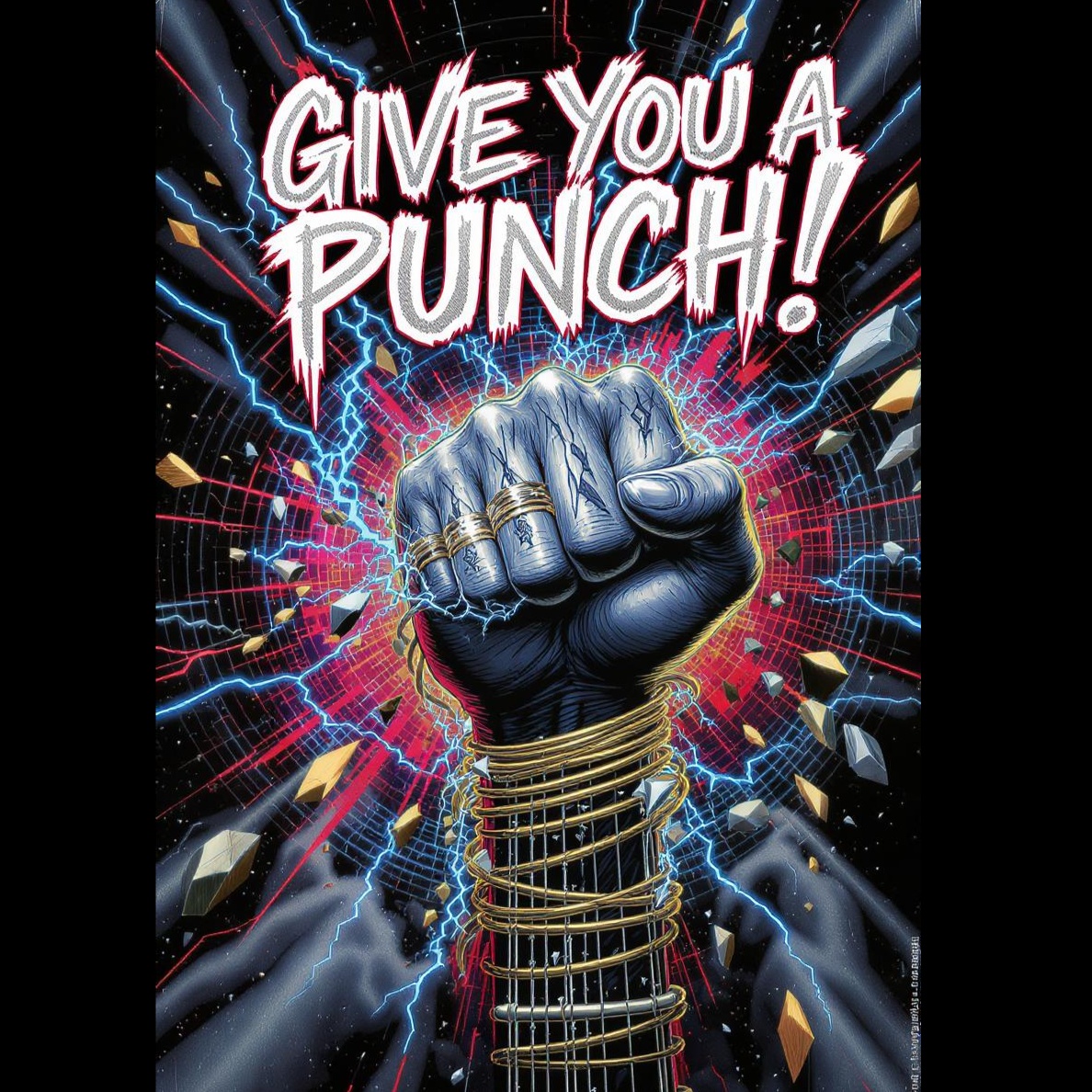 Create a bold, danceable fusion of death metal, reggaeton, and Indian sitar, Track opens with hypnotic sitar riff and tight reggaeton percussion, Add heavy, downtuned guitars, rapid blast beats, and deep guttural death growls in the verse, Chorus explodes with chugging riffs, layered “PUNCH!” crowd chants, sitar hooks, and an irresistible dem bow groove, The energy is wild, cathartic, and aggressive—music for letting out frustration and rage with humor and freedom, Bridge and breakdown feature exotic sitar leads, percussive breakdowns, and filtered, shouted vocals, Vibe is intense, hypnotic, and liberating, Vocals: verse in growled, rhythmic death metal style; chorus with gang chant and punchy shouts; occasional spoken lines for humor, Use metallic hits, reverse cymbals, and glitch FX for texture