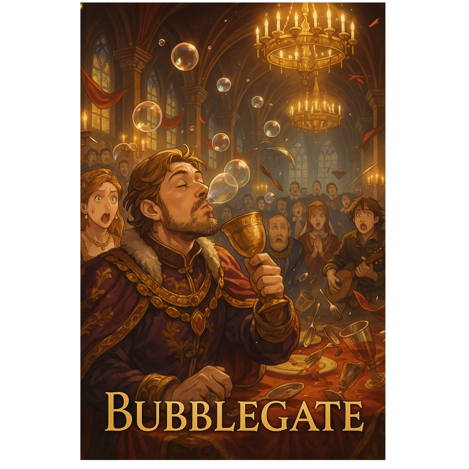 Majestic operatic metal comedy, 120 BPM, royal pomp meets absurd chaos, Opens with cathedral choir—crystal clear, forward in the mix, every consonant and vowel exaggerated, sharp “B” hits, Harpsichord and regal brass paint a lavish banquet, At 0:40, baritone narrates the “bubble incident” over pizzicato strings, choir gasps, guitars explode, drums crash like gates, Metal riffs alternate with comedic ragtime and cimbalom, bass mandola mocks, Choir shifts from lush to staccato “B” alliterations—each “B” is a drum, vowels stretched, consonants crisp, Growls/tenors trade lines, escalating into baroque-metal mayhem, Vocals and choirs always sit above instruments; every word is crystal clear, as if sung for a theater audience, Sudden silences with giggles/glass clinks; chaos returns, No vocals ever masked—guitars/piano/drums back off in volume and highs whenever vocals or choir sing, No chorus or distortion on main vocals, Theatrical diction throughout, like spoken opera, for maximum clarity