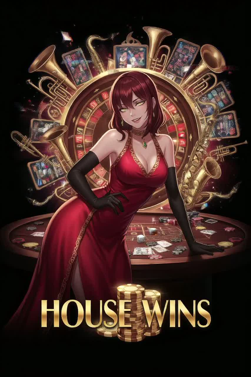 Form: Intro glitch brass → Verse swing vox → Pre piano+brass → Chorus Lady Luck deals death → Drop guitars+blast beats+growl HOUSE WINS → Post chip scatter laugh → Verse 2 cabaret swing → Pre → Chorus → Bridge heartbeat+roulette FX → Final Drop crushing riffs+brass stabs+growls → Outro Rhodes fade whisper your last chip’s mine