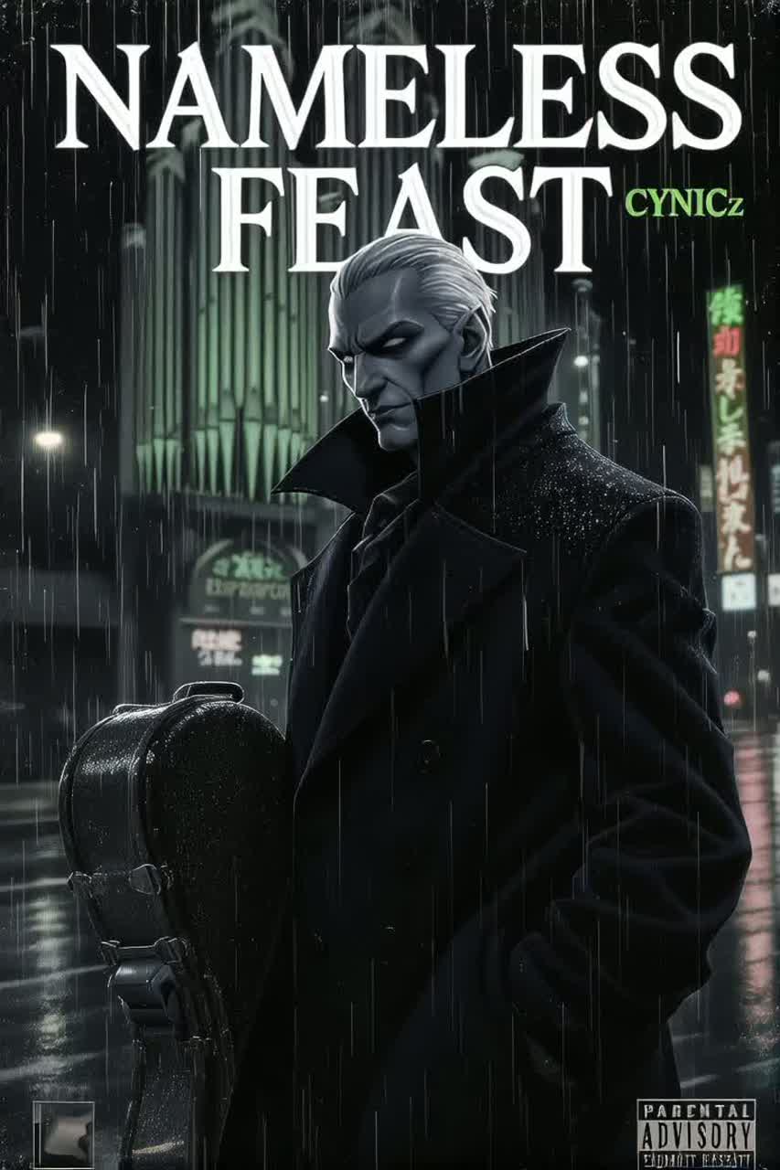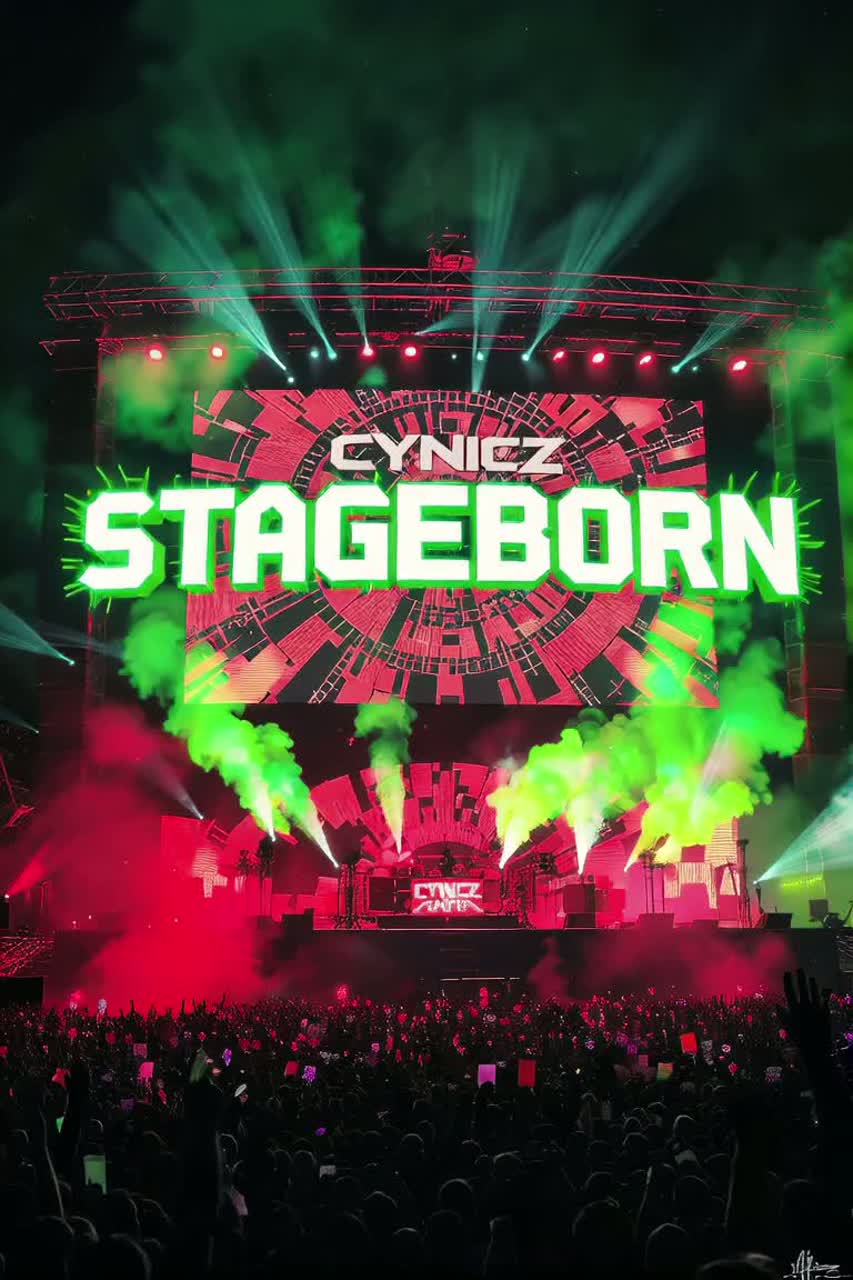 142 BPM, Dm, Nu Metalcore × Funk Rock × Stadium Live, Groove: birch kit — deep kick, steel snare crack, titanium hi-hat ticks, toms w/ arena reverb; Bass: 5-string ash slap bright mids, carbon fretless slides, sub growl; Guitars: mahogany 7-string EMG crunch riffs, wah-wah chops, talkbox; Electronics: Moog steel-frame growl lead, DJ scratches, glitch FX; Pads: detuned analog swells, metallic risers; Vox: rap verses fast, rhythmic + sung anthemic chorus doubles + screamed bridge; Crowd: constant — cheers, stomps, chants “CYNICz!”, “HEY!”, “WHOA-OH!”, whistles, applause woven under all sections, louder in choruses & breakdowns; Form: Intro crowd+spoken welcome → verse rap/funk groove w/ background roar → pre-chorus riser+bass gliss+crowd swell → chorus heavy riffs+chants → post scratch break → verse2 denser funk groove+chants → chorus full stack+talkbox+roar → breakdown w/ slides+scream vox+chaotic shouts → final chorus stadium-wide → outro fade w/ applause; Theme:debut concert adrenalin, ‑acoustic, ‑lo-fi, ‑ambient, ‑orchestral cinematic, ‑chillhop, ‑lofi hip hop