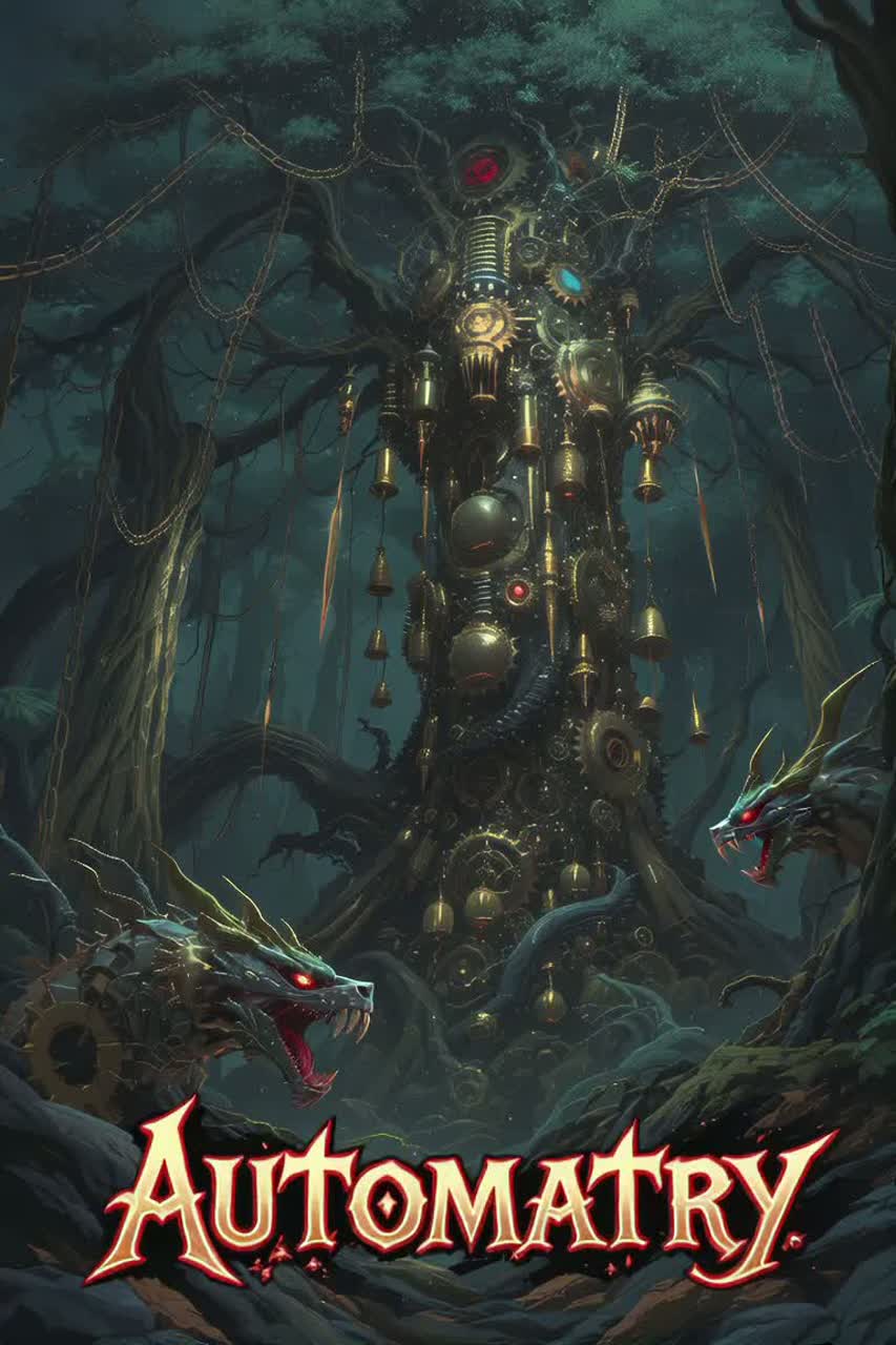 Form: Intro gamelan bells+grinding → Verse jungle+growl gears grind → Chorus full stomp chants Iron leaves slice and tear! → Verse steam jets+servos+brass beasties → Bridge breakdown chant automatry → Final Chorus growls+stomp+gamelan bells → Outro fading bells+steam ambience