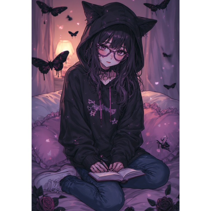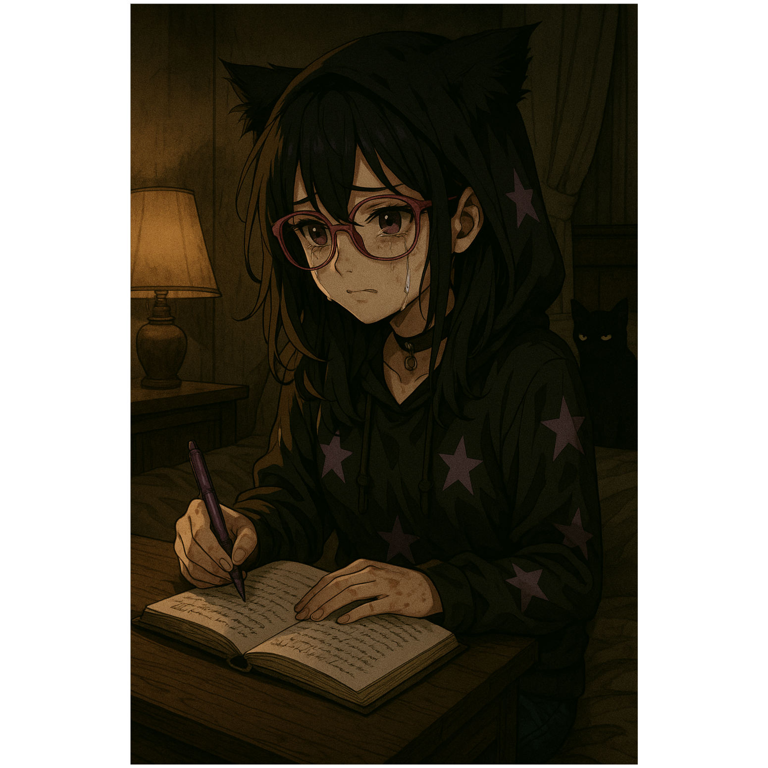 A dark bubblegum pop, alt pop track with a sweet yet ominous melody opens with a mysterious music box over lo-fi bass and minimal darktrap beats, Verses blend emotional, shy female vocals with warped synths and dreamy guitar, Choruses surge with glitchcore, weirdcore, and emo beats, cultivating a darkwave, psych-pop atmosphere, The outro gently circles back to the music box, dissolving into lush, moody ambient synths that echo in the fade