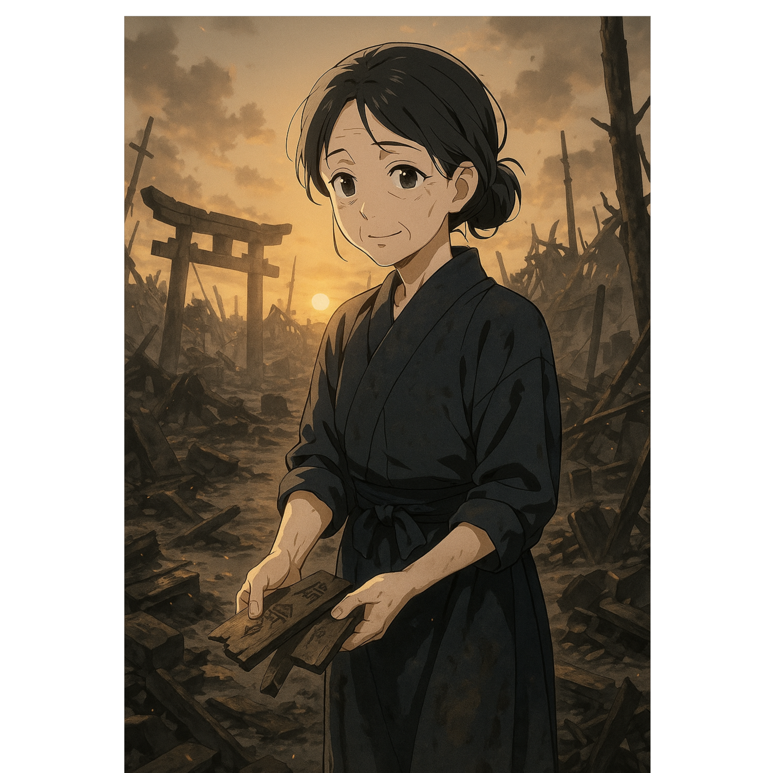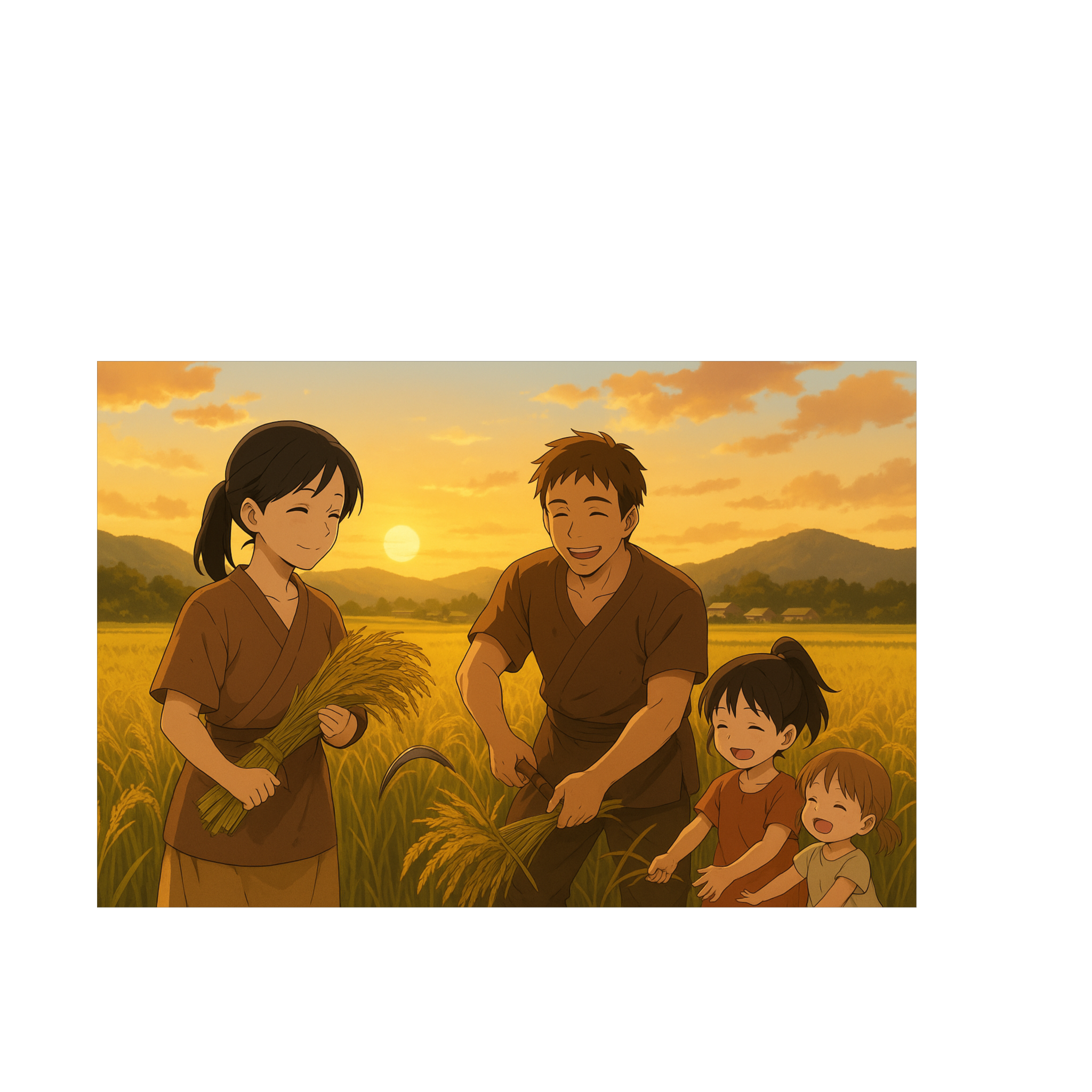 rio core, Japanese folk rock with choir, Warm and earthy atmosphere, Traditional Japanese instruments such as shamisen, koto, and taiko blended with acoustic guitar and light electric guitar, Moderate tempo, steady rhythm like farm work, Female lead vocal, gentle and calm, Mixed choir in the chorus, sounding like villagers singing together, Not prayer-like, but daily life and honest labor, Bright daytime feeling, rural village, rice fields