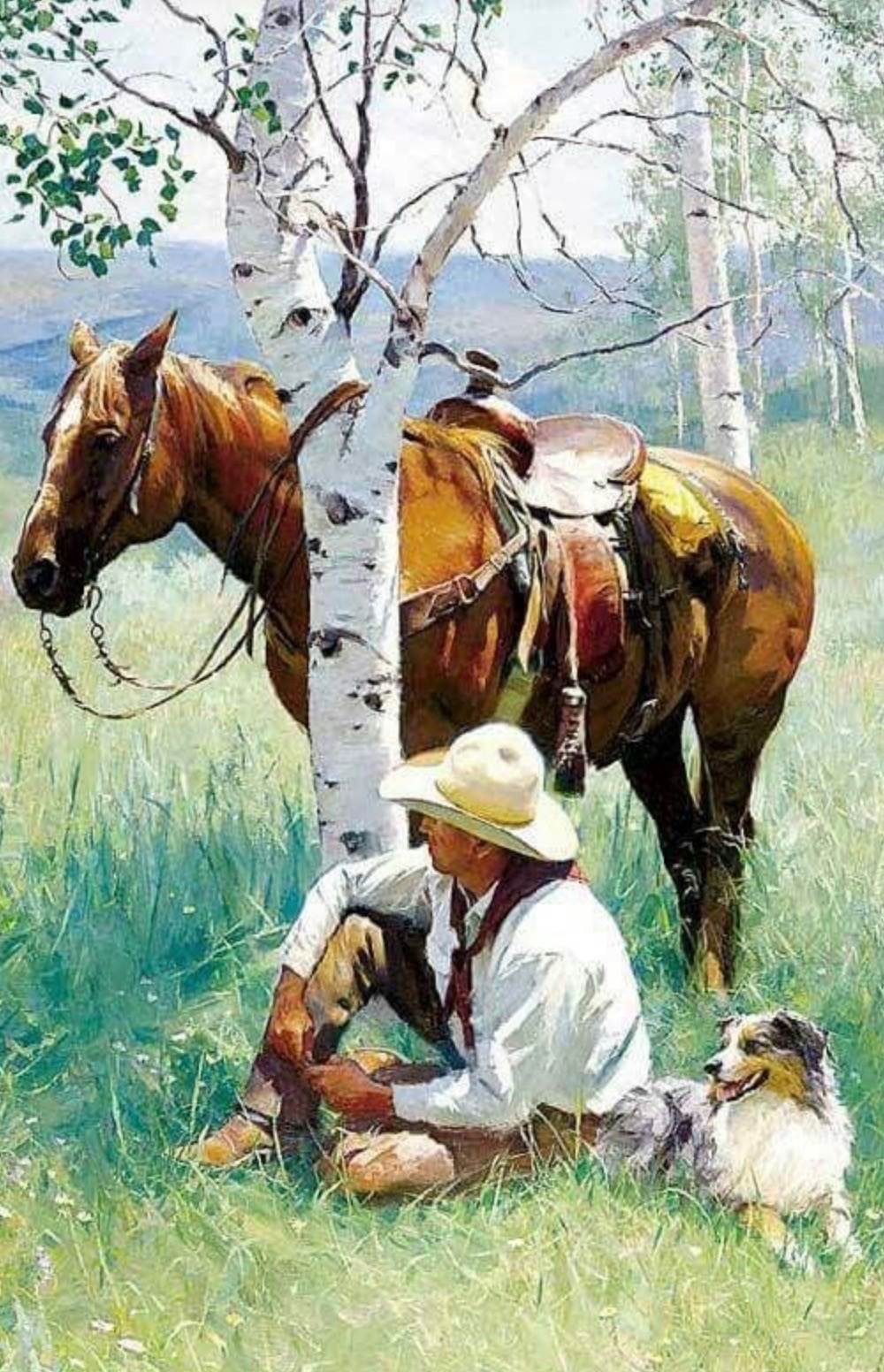 Slow cowboy ballad with plainspoken storytelling, Tempo ~72–76 BPM, 6/8 (or gentle 3/4), Key D major (lean into B minor color), Instruments: fingerpicked acoustic guitar up front, soft upright bass, brushed snare with light swells, spare fiddle lines, subtle pedal-steel pads (no solos), optional faint harmonica at section ends, Vocal: warm baritone, intimate/dry room, low reverb—like a small bunkhouse, Mood: stoic, tender, not sentimental; wide-open feel, Narrative: a stray pup is fed scraps in a dusty town, trails the rider into the mountains, trust builds without names or words, the dog keeps night watch, they share food and miles; in the end the man falls in a grizzly fight and the dog keeps guard until he rests too, Refrain hook: ‘No name needed, no word said—four legs keeping what two legs tread, ’ Structure: Verse–Refrain x2, Verse, Verse, Refrain, Bridge (final watch), Final Refrain, short Outro, Keep lines short and clear, imagery-driven (dust, juniper, coals, creek, stars)