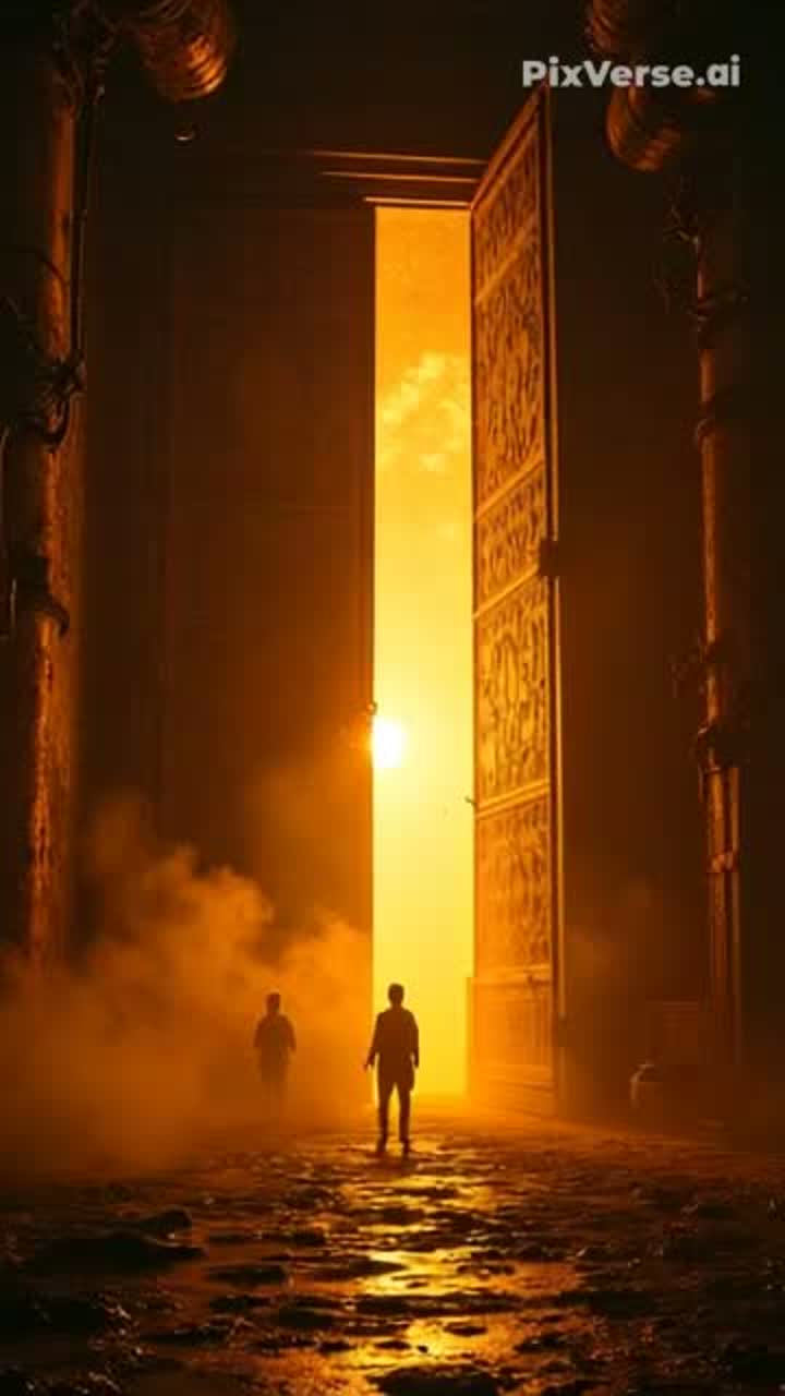 Cinematic psychedelic rock soundtrack, slow hypnotic tempo, deep tribal toms and rolling floor drums, droning vox organ chords sustained with eerie reverb, tremolo baritone guitar riffs with desert-like delay shimmer, swirling sitar accents, reverse cymbal swells, bass guitar in droning modal line, atmospheric strings in the background, long reverb tails, whispered wind-like synth pads, analog tape hiss texture, occasional DJ scratches subtle, dramatic pauses with cliffhanger silence then sudden tribal drum fills, hypnotic minor modal progression, swirling stereo effects, crescendo builds into chaotic instrumental sections then drops back to minimal organ drone, echoing guitar feedback, cinematic thunder FX layered with metallic crashes, psychedelic breakdowns, extended instrumental improvisation vibe, haunting cinematic intensity, ambient noise layers, dark cinematic desert atmosphere, mysterious soundtrack mood, progressive structure with evolving tension, final outro fading with org