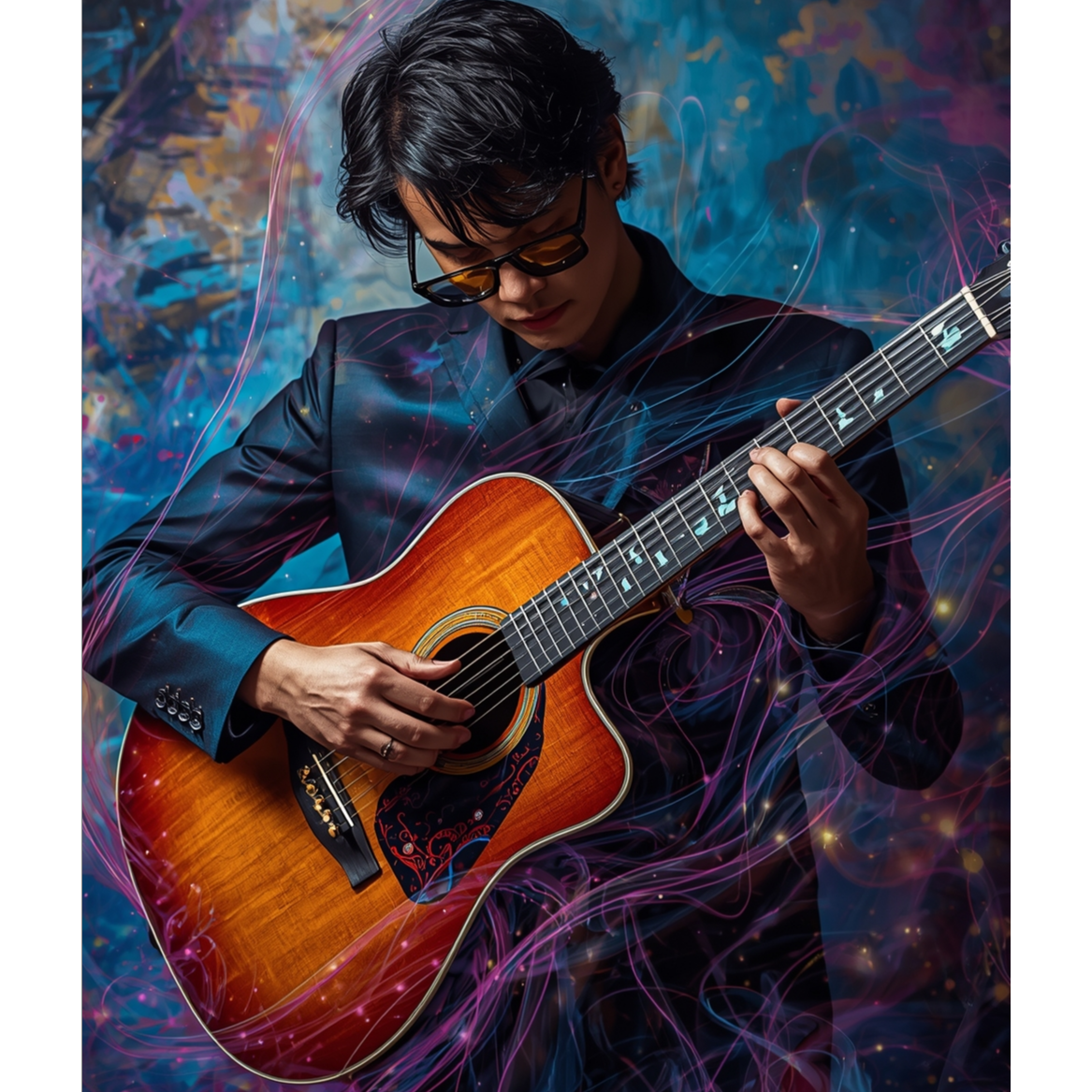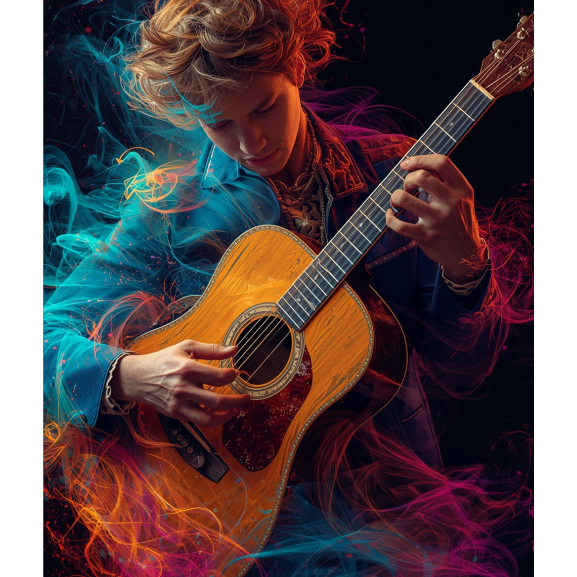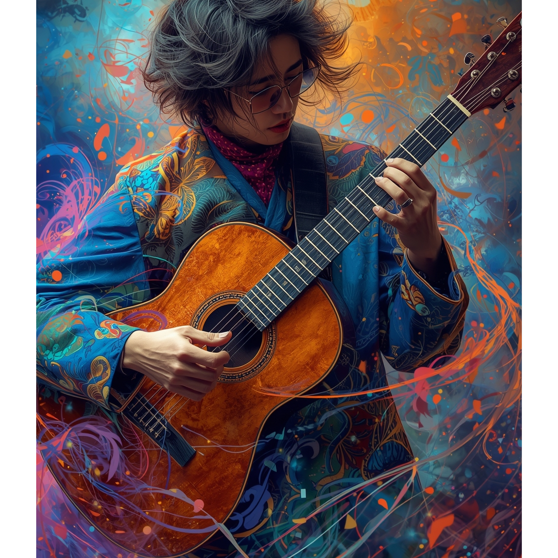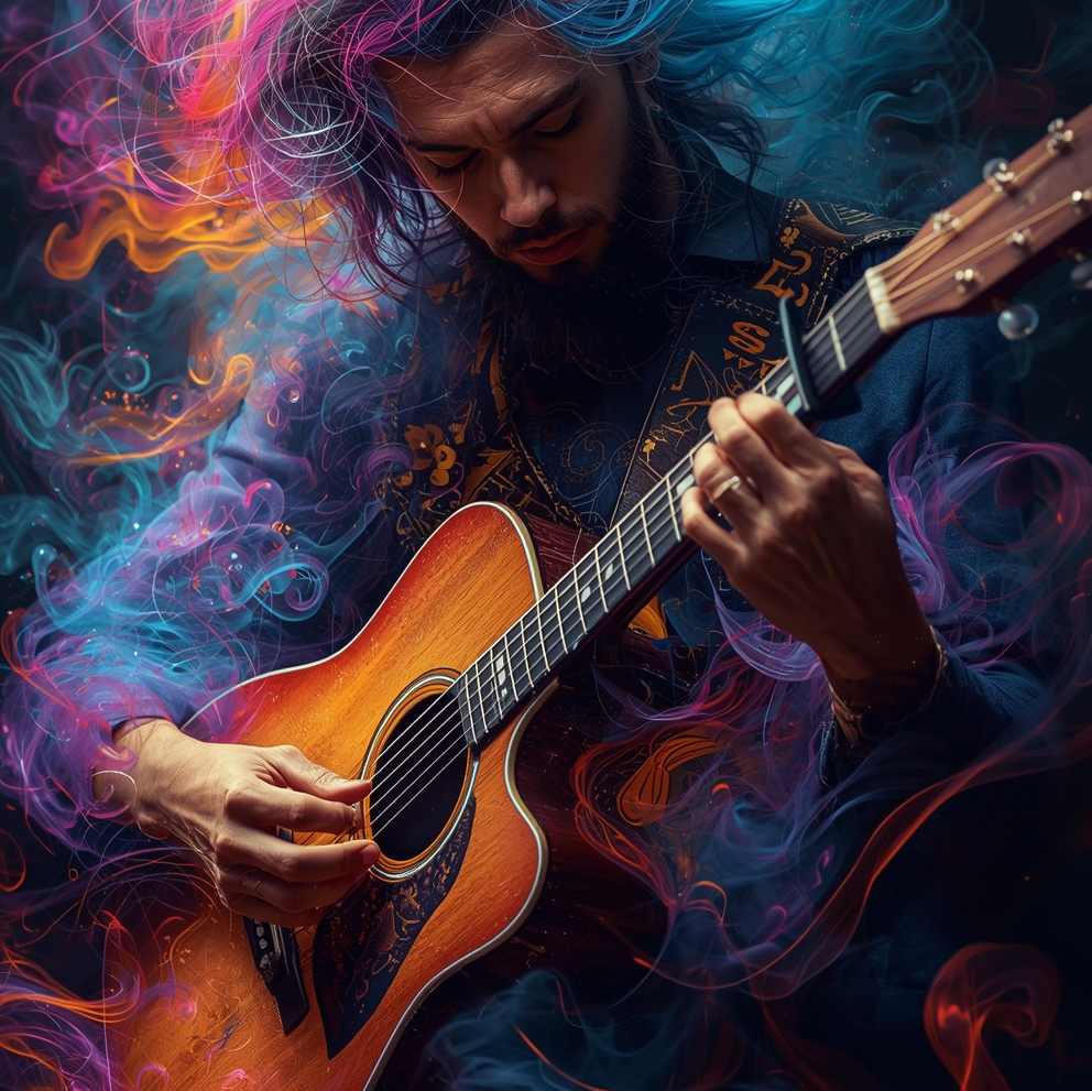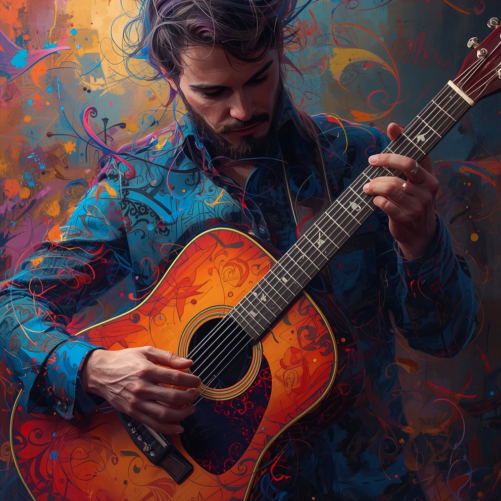 This acoustic guitar solo features intricate tapping harmonics and sharp slap techniques, weaving percussive rhythms with melodic lines, Open tunings highlight resonant overtones, creating a rich, textured soundscape that evolves dynamically, spotlighting virtuosic fingerstyle skill