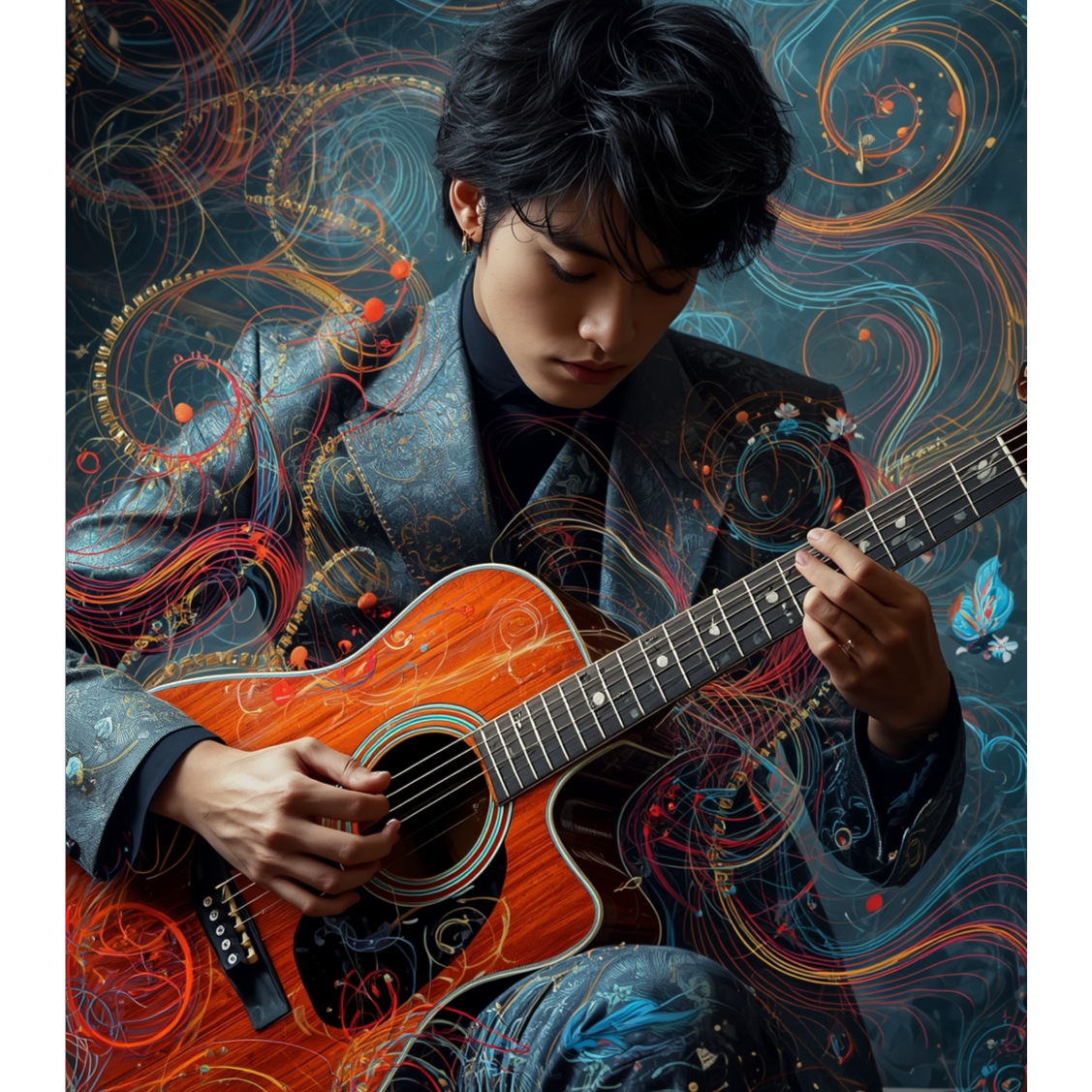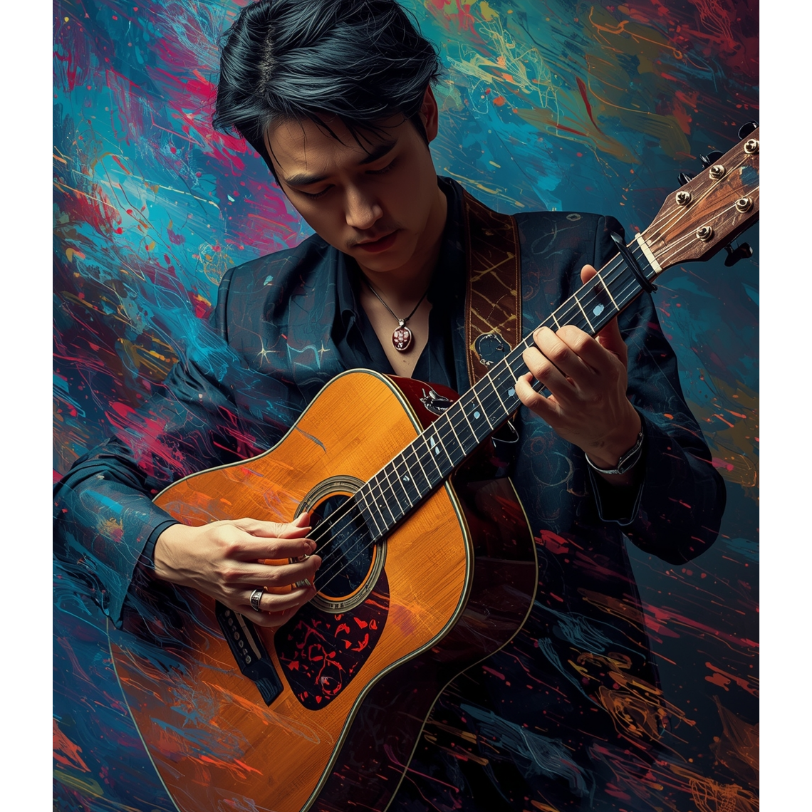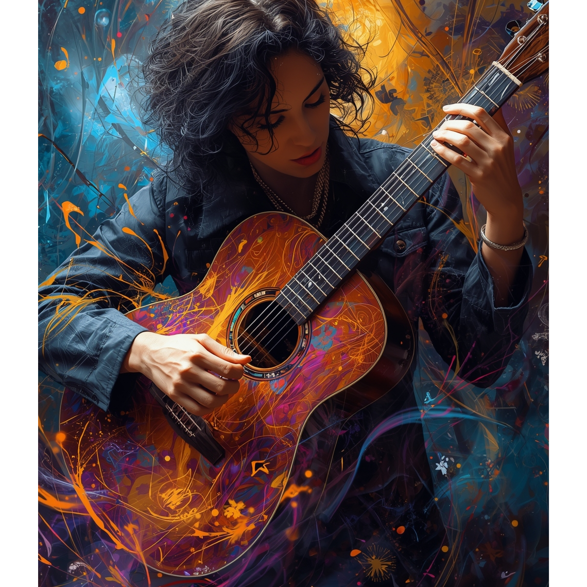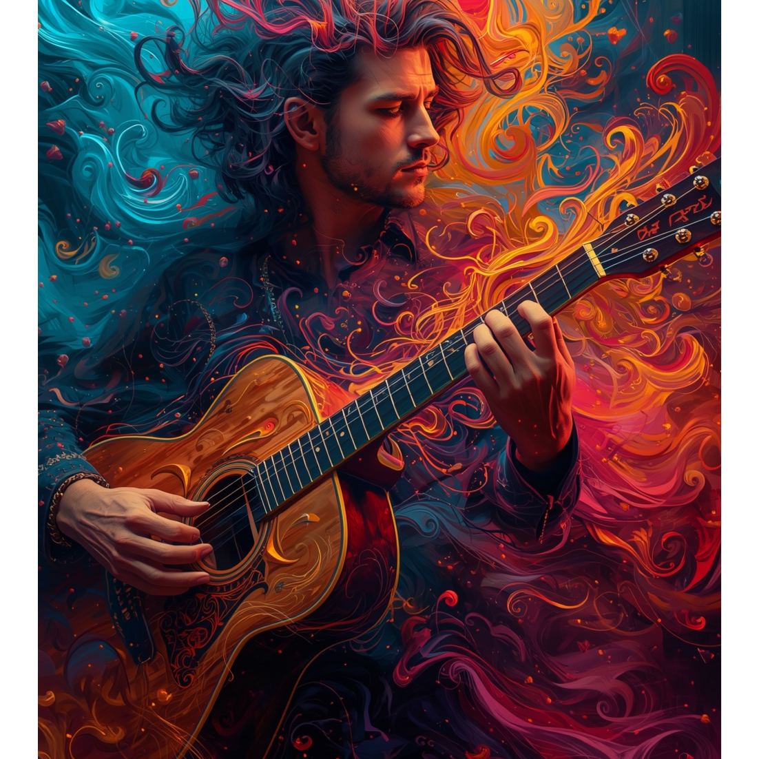 This acoustic guitar solo features intricate tapping harmonics and sharp slap techniques, weaving percussive rhythms with melodic lines, Open tunings highlight resonant overtones, creating a rich, textured soundscape that evolves dynamically, spotlighting virtuosic fingerstyle skill