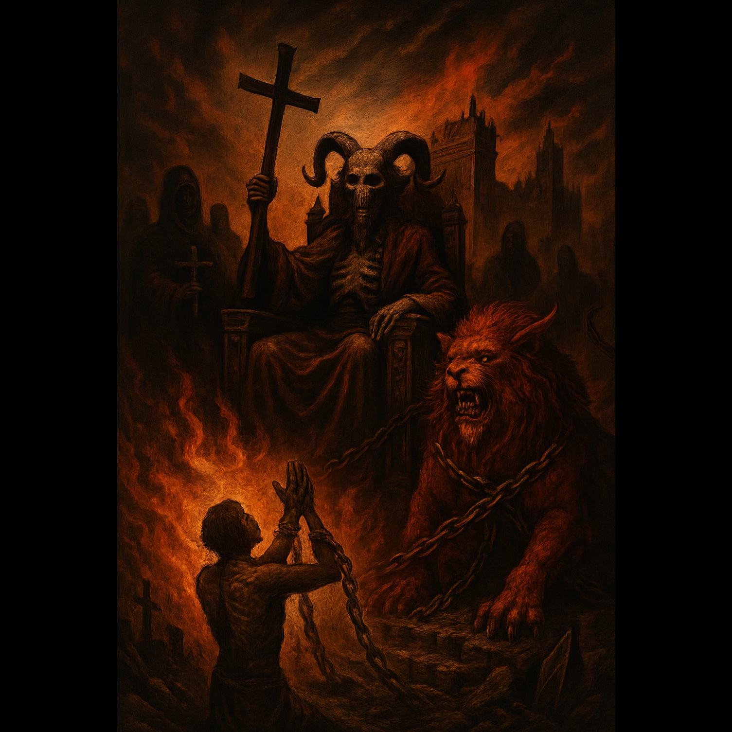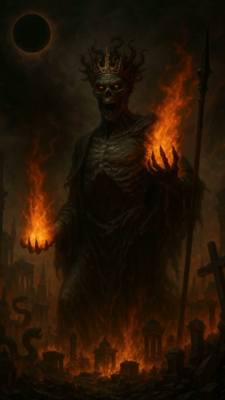 Death Metal Old School, Blackened Metal, Raspy Male Vocals, Agressive Male Vocals, Agressive, Fast, Hell, Dark, Doom, Apocalyptic, thunderous, terrifying, aggressive drums, ominous, 200 BPM, Raw, Prophetic, Guitar Riffs, Guitar Solos, ‑Clean Voices