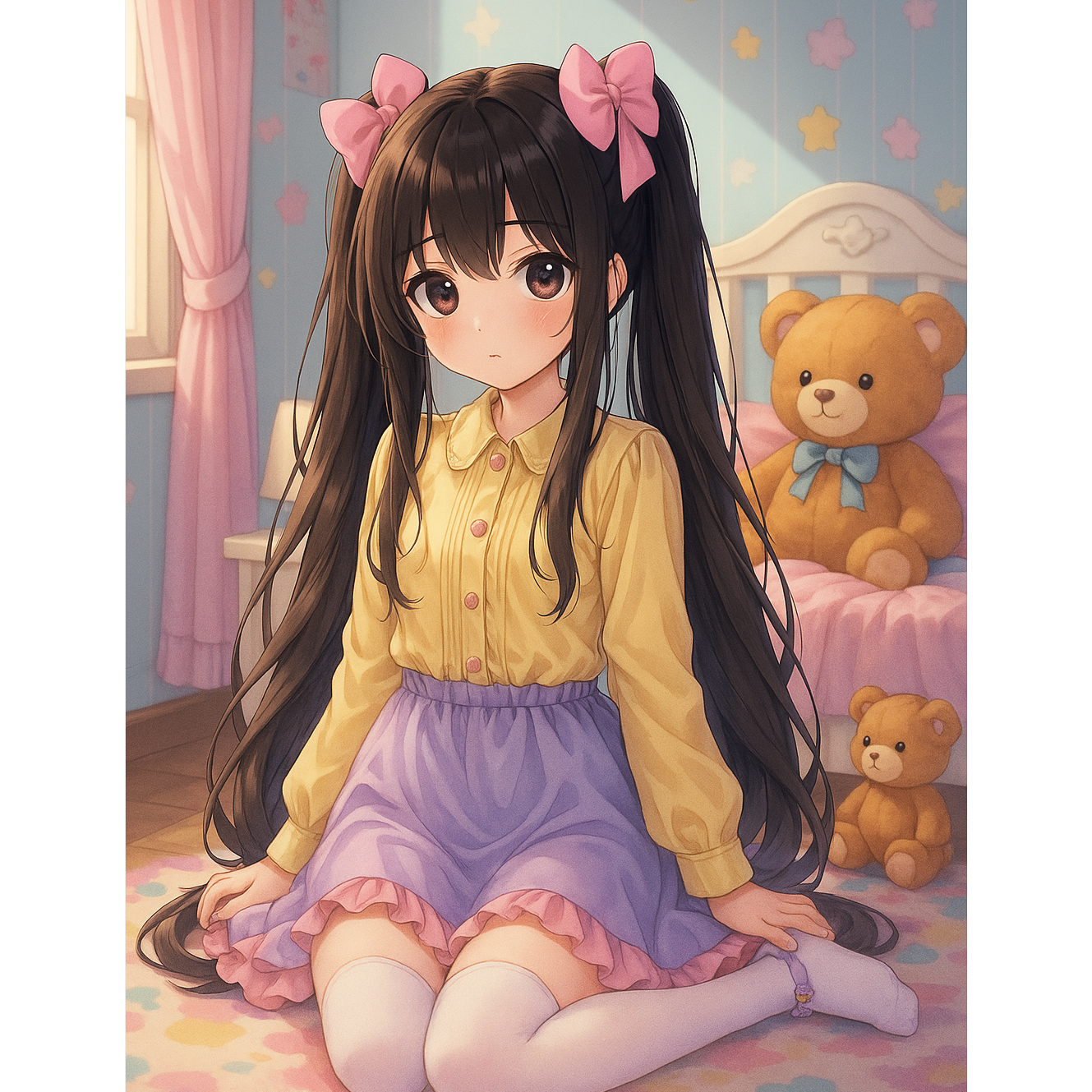 Begin with a delicate music box intro, layered with a baby piano and distant, tinkling childish synths, Playful, almost toy-like percussion meets experimental, ambient textures, The shy, sweet female vocal floats softly above a foundation of dark bubblegum pop beats, balancing melancholic lullaby motifs with a rare, charming, creepy-cute flair, Each section blends alt pop currents and yume kawaii dreaminess, all tied together by haunting nursery rhyme elements and catchy, playful hooks