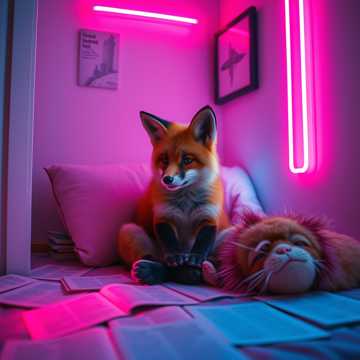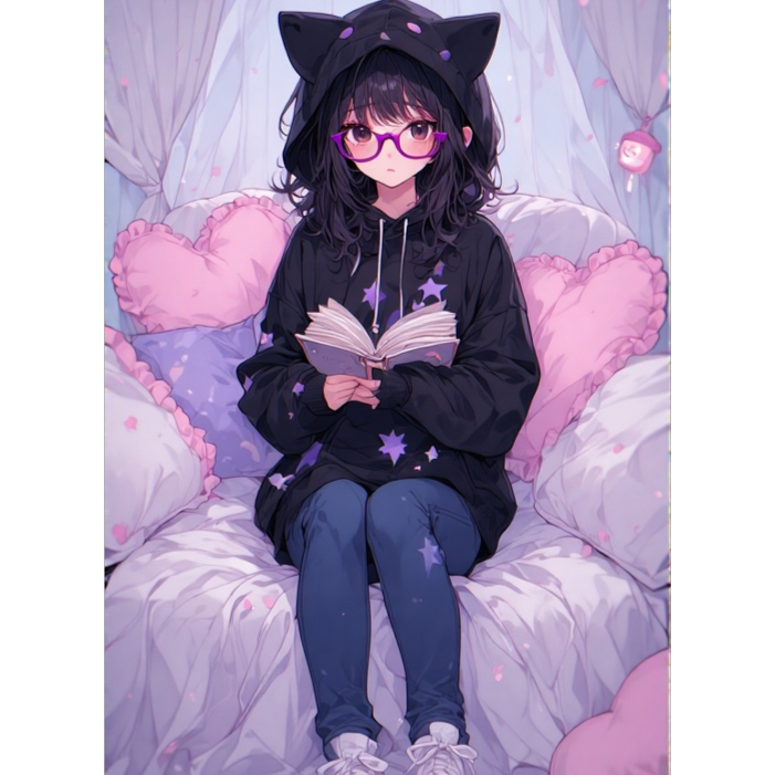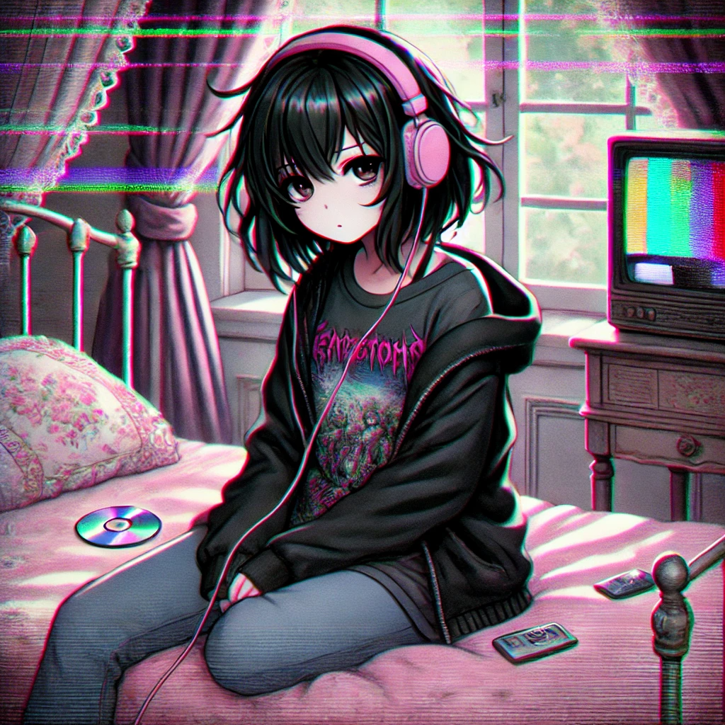 Dark bubblegum pop, Japanese pop, introspective girl alone in a cozy dimly lit room, neon lights casting soft glows, diary and scattered papers around, headphones on, melancholy but whimsical