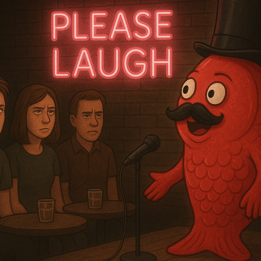 fast, witty alt-pop/nerdcore hybrid in E minor groove with a playful iiโVโIโvi chord cycle, The production is cartoonish and tongue-in-cheek: accordion leads, kazoo bursts, plunky synth stabs, and clattering percussion provide the comedic backbone, Vocals are delivered with rapid-fire patter and corny bravado, balanced by gang-shout choruses and exaggerated audience groans layered into the mix, The overall sound is both bouncy and awkwardly theatrical โ a deliberate parody of comedy-rap bravado, leaning into its own cheesiness