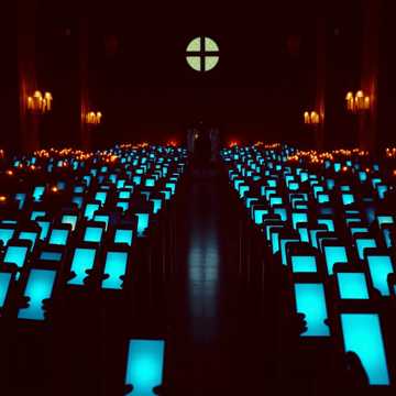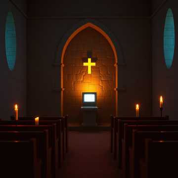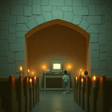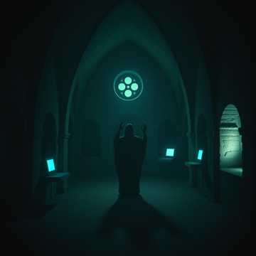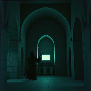 liturgical electronic minimalism 68 bpm slowmoving synthesizer pads with heavy portamento pipe organ drones subbass like distant cathedral bells electronic beats with massive reverb decay times alternative rock, electronic, experimental, art rock vocals catechismstyle call and response childrens choir samples processed through heavy bitcrushing and analog tape saturation lofi texture gradual build with addition of highfrequency synthesizer shimmer representing light through stained glass themes of glowing rectangles as icons atmosphere dark chapel with hundreds of phone screens illuminating faces like votive candles and distant distorted childrens choir leaking from the confessional booth