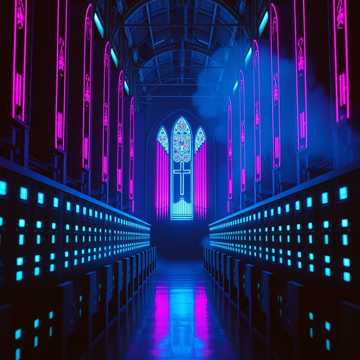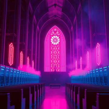 Sacred electronic music, 100 BPM, pipe organ blended with analog synthesizer, heavy sub bass like church bells, electronic beats processed through cathedral reverb, falsetto vocals hymnal and reverent, choir samples distorted through bit crushers, lyrics about digital religion and online worship, gradual build to ecstatic climax, themes of spirituality in the age of noise, sacred and profane textures, mood: technological transcendence, atmosphere: server farms built inside deconsecrated churches