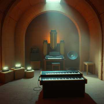 sacred analog electronic ritual 60 bpm juno106 with heavy portamento and subbass at 25hz childrens choir processed through wahwah pedal and heavy distortion singing about endpoints as holy places alternative rock, electronic, experimental, art rock vocals as anointer with sacred oils represented by synthesizer sweeps pipe organ with leslie speaker percussion from opening and closing dvd drives as ritual rhythm themes of api endpoints as altars and json as holy oil atmosphere temple with stone altars labeled get post put delete children processing with oil lamps heavy analog saturation