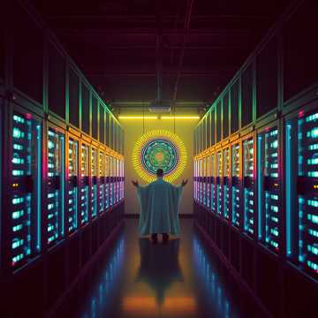 ceremonial analog electronic 64 bpm prophet 5 and juno layered for rich harmonic drone subbass at 26hz childrens choir processed through heavy tape saturation and wowflutter singing hymns to root access alternative rock, electronic, experimental, art rock vocals as worshipper prostrate before the terminal pipe organ with tremolo effect percussion from typing on mechanical keyboards as ritual rhythm themes of worshipping administrator privileges as divine right atmosphere stone chapel with a single terminal on the altar and children processing with burning usb sticks as candles heavy analog warmth