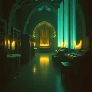 warm analog sacred electronic 78 bpm pipe organ bass pedals blended with moog subbass roland juno106 pad chords with slow attack electronic drums processed through bricasti m7 cathedral reverb alternative rock, electronic, experimental, art rock vocals in hymnal gregorian phrasing with heavy tape delay childrens choir samples pitched down and distorted through guitar amplifiers fender twin reverb saturation gradual build from solo organ to full electronic orchestra warm studer tape saturation subfrequencies below 40hz themes of digital monasticism ecstatic climax with arpeggiated synthesizers atmosphere underground monastery with fiber optic candles and hidden tape machines