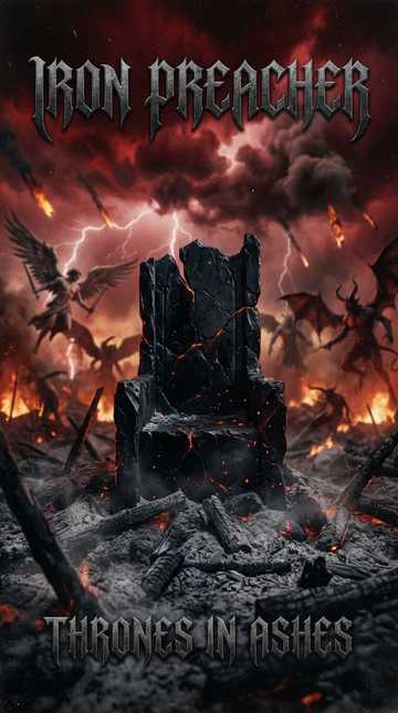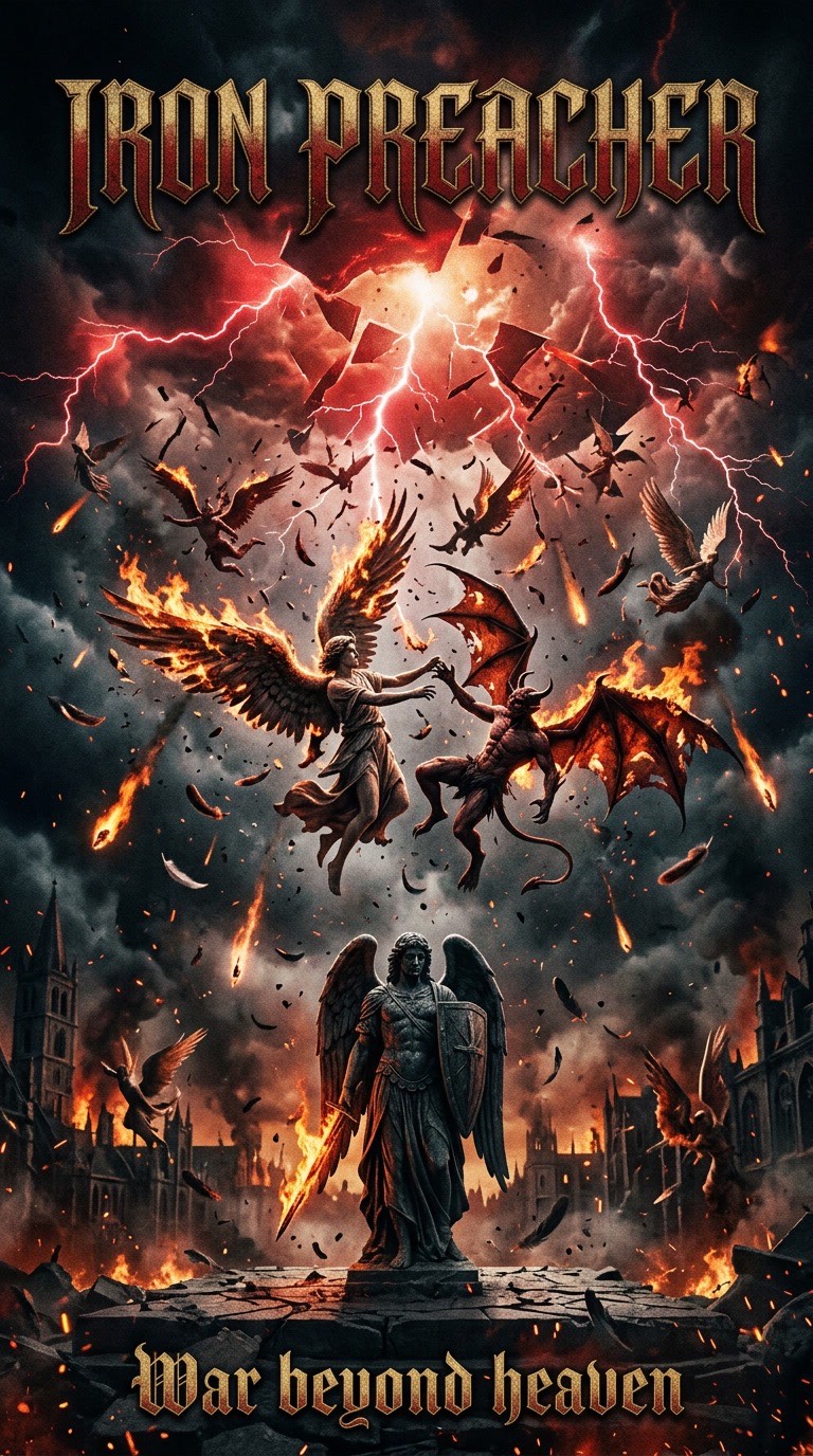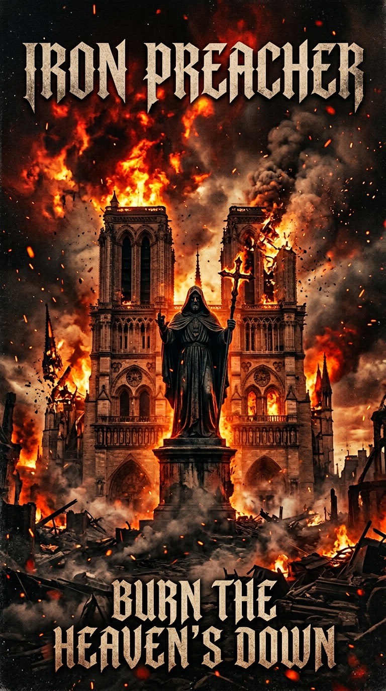 Fast European gothic power metal with aggressive tempo, driving double-kick drums, and fast pipe organ runs, Dual male vocals: one divine and commanding, one dark and defiant, Minimal choir layers, focus on rhythm and intensity, Militant, apocalyptic atmosphere