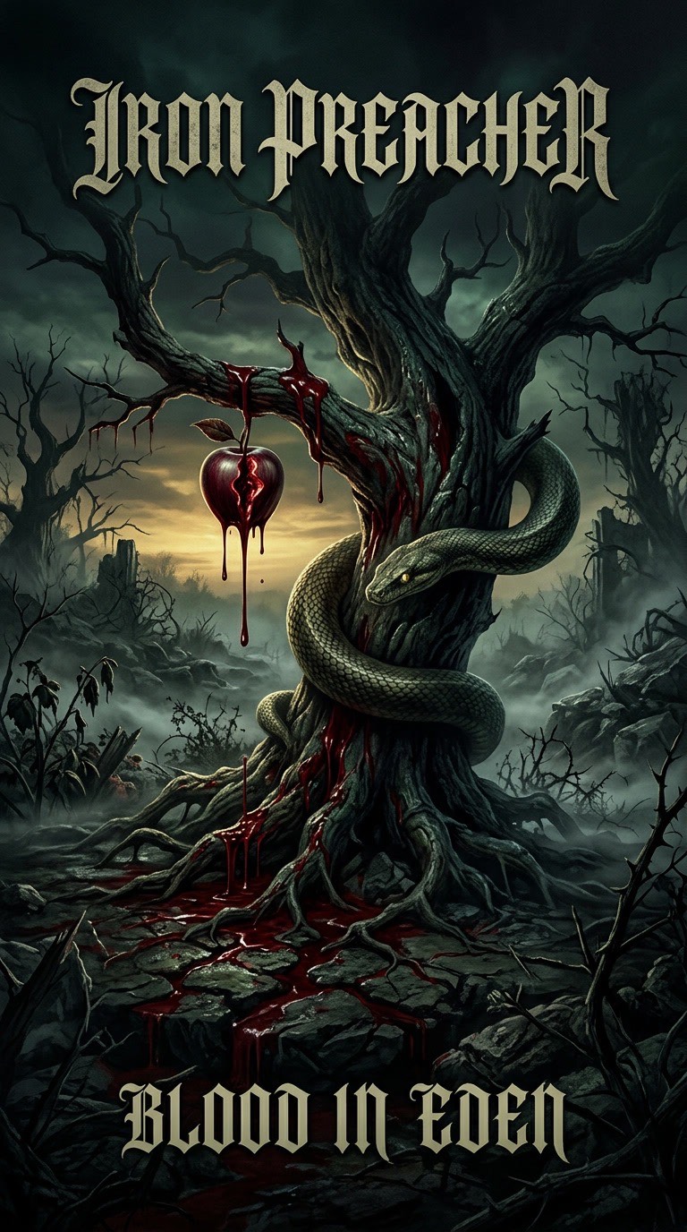 Dark European gothic power metal with dominant cathedral pipe organ, Slow to mid-tempo heavy riffing, minimal but powerful double-kick drums, Deep dramatic male baritone vocal with controlled vibrato and theatrical delivery, Choirs are sparse and low in the mix, used only for subtle reinforcement, not arena-style, Atmosphere solemn, liturgical, and intense, Minor key harmonies, Emphasis on organ and dark melodic tension, No modern metalcore elements