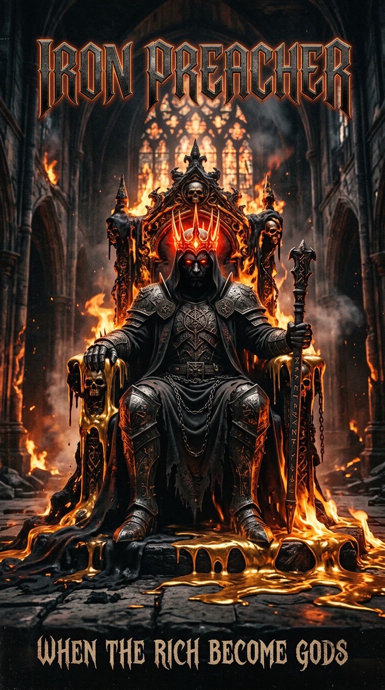 Gothic Power Metal with heavy religious and occult themes, Dark church organ intro, followed by dramatic guitar riffs and double-bass drums, Mid-tempo, majestic, powerful and mysterious, Male lead vocal: deep, charismatic, preacher-like with theatrical flair and strong vibrato, Choirs in the chorus: cathedral-style mixed choir (male and female), chanting “Illuminati!”, Big bombastic drums, layered guitars with melodic leads, Tone: darkly humorous, grand and gothic, with a wink of irony, Add subtle church bells and Latin whispers in background for atmosphere, Avoid overly modern production – keep it warm, analog, 80s/90s metal tone, Tempo: 110–120 BPM