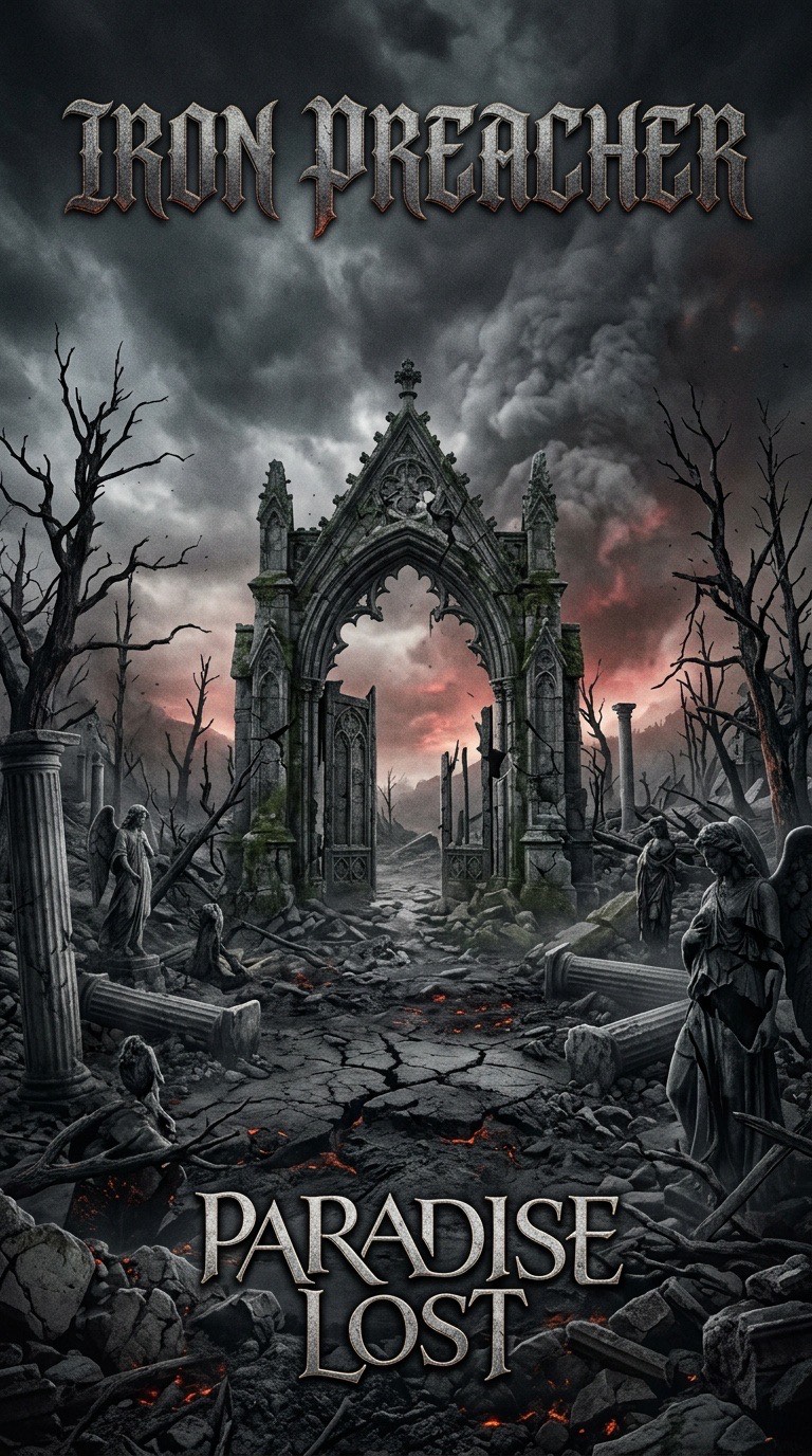 Epic European gothic power metal with slower tempo and heavy atmosphere, Pipe organ, deep cinematic sound, and emotional weight, Dual male vocals but more restrained and somber, Minimal choir, focus on melody and atmosphere, Dark, reflective, apocalyptic tone