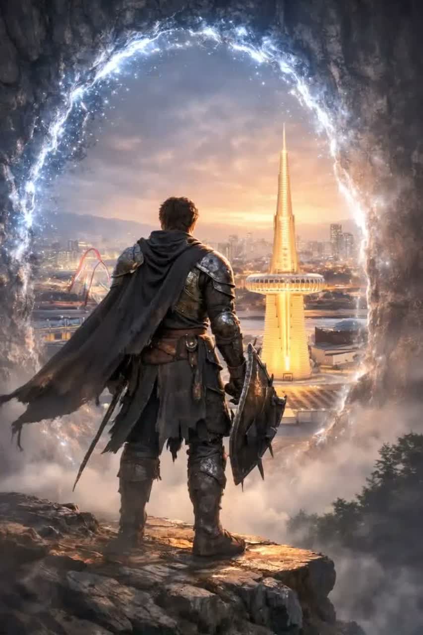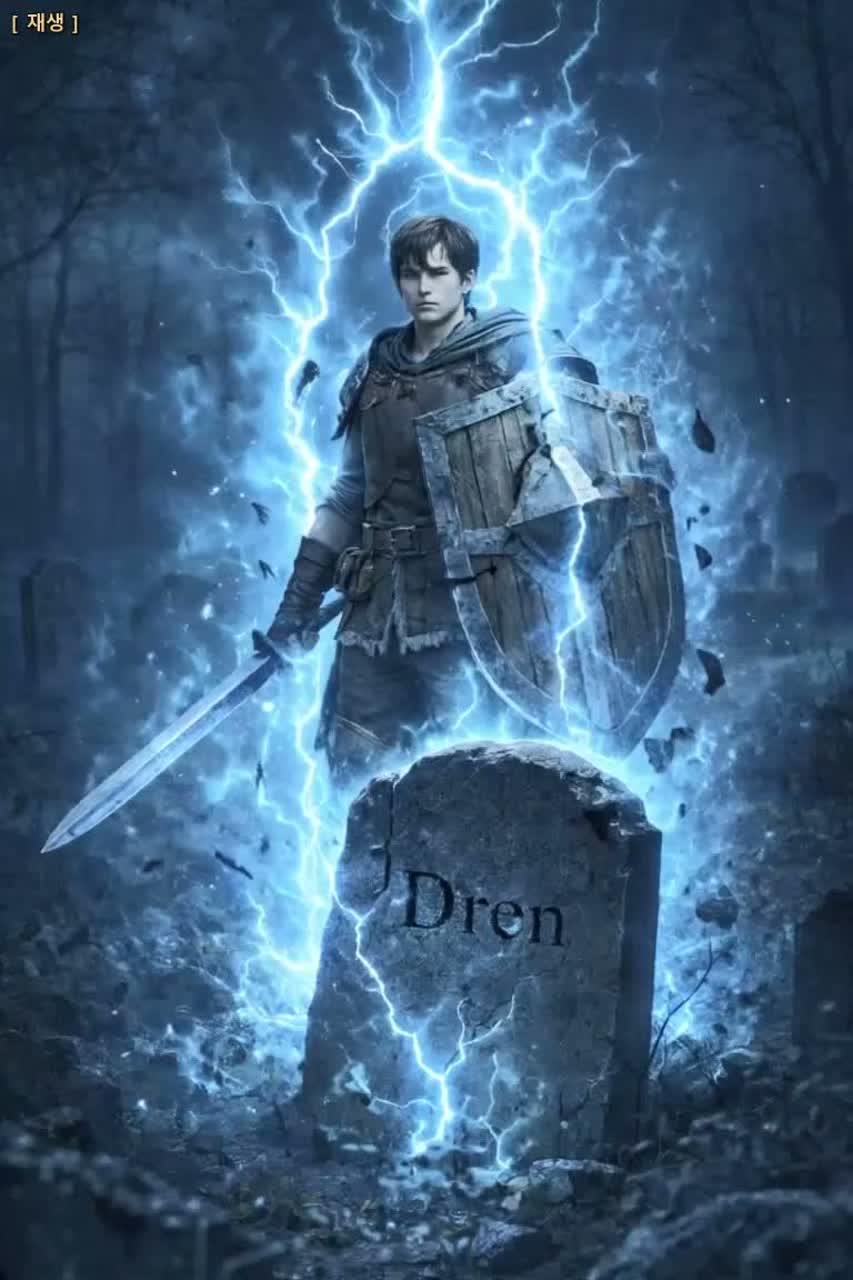 The scene begins in a quiet graveyard beside a great fantasy city market where a fallen knight has already been buried after a terrible battle, A small team arrives too late and stands before the grave in silence, Wind moves through stone and trees, Suddenly an ancient resonance power bends space and time, Low orchestral tension rises as a time fracture opens, The final moment before the knightโs death is pulled from the past into the present, The knight is rescued from the second before the fatal strike, Music grows into powerful cinematic orchestral tension and ends with a solemn epic atmosphere, Add a deep male narration voice explaining that the knight survived, but his original world is now closed