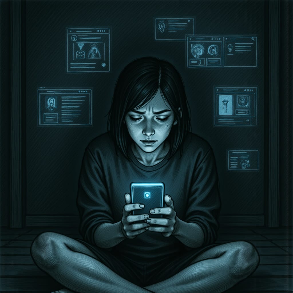 Melancholic trap, 70 BPM, hollow production, Female vocals: conversational, like talking to yourself in empty rooms, Sparse percussion - hollow kicks, finger-tap snares, notification-ping hi-hats, Minimal bass, restrained even in choruses, Interface sounds, room tone, device hum, Vocals dry and close in verses, slightly distant in pre-chorus, doubled but not harmonized in chorus, Raw unprocessed bridge, Theme: digital loneliness without melodrama, the routine of checking feeds, collecting quiet worries, Mechanical rhythms mirror scroll patterns, Space between elements represents connection gaps, Resigned acceptance, not desperation