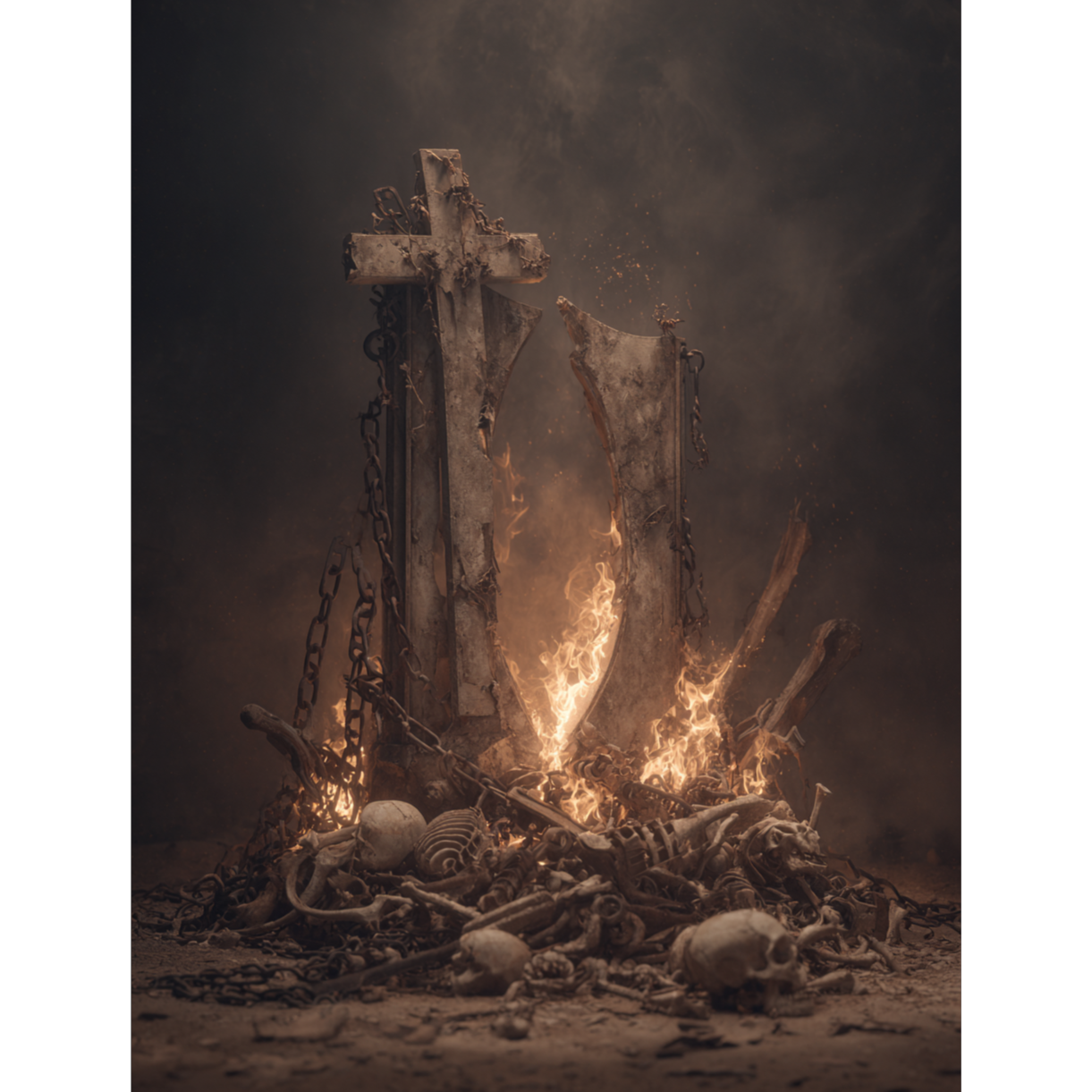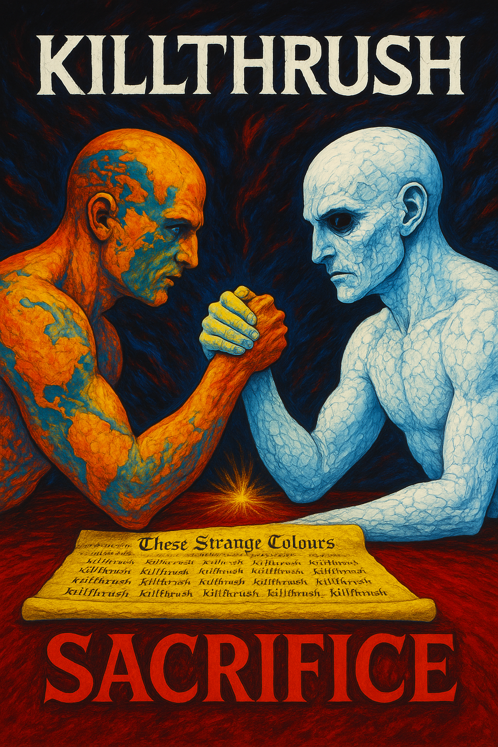 A brutal fusion of blackmetal, thrashmetal, and doommetal: relentless tremolo-picked guitars and blast beats launch the intro, shocked by sudden thrash tempo shifts and abrasive palm-muted riffs, The bridge slows into dense, down-tuned doom, layering guttural bass and foreboding double-kick before racing to a chaotic, dissonant close