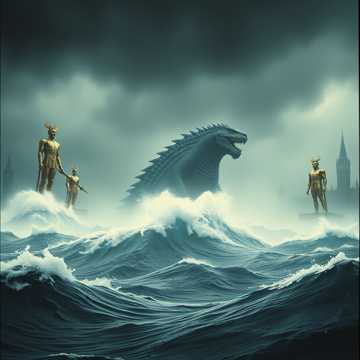 Epic battle orchestral, instrumental, 150 BPM, D minor, Massive scale, cinematic action, Opens with deep, ominous brass and rumbling low percussion suggesting something vast moving beneath the surface, Timpani rolls build tension before the full orchestra erupts with a driving, relentless battle theme, Layered percussion -- taiko drums, frame drums, cymbals -- propels the arrangement at breakneck pace, Strings carry rapid melodic figures while brass punches through with heroic fanfare motifs, The middle section features a brief passage of terrifying low-frequency drones and distant percussion suggesting the scale of the threat, before the battle theme returns at full force with added choir-like string harmonics, The climax brings every instrument to maximum intensity, ending with a massive orchestral hit and sustained reverb decay, Production should feel like the sea itself rising to attack -- enormous, primal, earth-shaking, ‑modern instruments, ‑electric instruments, ‑vocals