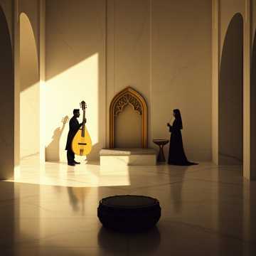 Building dramatic orchestral, instrumental, 95 BPM, A minor, Authority, tension, and defiance, Opens with a solo oud playing a formal, deliberate melody over sustained low strings -- the sound of a marble throne room, Brass enters with stately, foreboding chords suggesting divine power, The arrangement builds through three stages: first, oppressive grandeur (heavy brass, deep percussion, minor harmonies); second, a stripped passage of solo Greek lyra and cello representing vulnerability amid power; third, a transformed version of the opening melody now carried by full strings with warmth and determination, frame drums adding a steady heartbeat beneath, The final section resolves from A minor to a brief, hard-won passage in A major before returning to minor for the closing bars, Production should feel like standing on heated stone in a room where the walls themselves are listening -- massive, political, charged with consequence, ‑modern instruments, ‑electric instruments, ‑vocals
