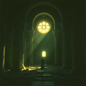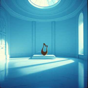 Dark ceremonial orchestral, instrumental, 76 BPM, Eb minor, Oppressive divine authority dressed in beauty, Opens with a sustained low brass chord French horns and trombones holding a cold, perfect fifth, over a crystalline high-string shimmer suggesting polished obsidian floors, A solo lyre plays a too-perfect, too-symmetrical melody: beautiful but sterile, like music composed by something that has never felt pain, Low timpani rolls punctuate the phrases like distant thunder, The middle section introduces a solo oud playing the Blind Man's Step motif beneath the orchestral texture -- hesitant, rhythmically uneven against the rigid divine perfection, the first hint of human doubt inside the marble machine, Strings build a slow, suffocating crescendo, The climax arrives not as an explosion but as a tightening -- every instrument converging on a single sustained dissonant chord that resolves only when the oud falls silent, Ends with the lyre alone, its perfect melody now sounding hollow, ‑modern instruments, ‑electric instruments, ‑vocals