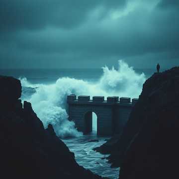 instrumental, C minor, Storm surges forth in violent elemental rage and desperate survival, Massive low-frequency rumble, sub-bass strings and timpani suggesting ocean gathering, 6/8 rolling string ostinato enters, Sea Surge motif churns and builds, Brass erupts with punishing, irregular stabs, chaotic, like force of nature with intent, Crashing cymbal waves and layered frame drums create percussive violence of water on stone, Middle section features terrifying passage of deep brass drones and rumbling percussion suggests cliff collapse: low, grinding, unstoppable, Solo Greek lyra cuts through chaos with Gaze Motif, desperate and bright, Climax features lyra and full orchestra in collision, her melody fighting against churning Sea Surge, strings racing, percussion relentless, Final bars shift abruptly: massive percussive hit, then sudden muffled quiet: stone doors sealing, the storm locked outside, only heartbeats remaining, Ends with single frame drum pulse fading, ‑modern instruments, ‑electric instruments