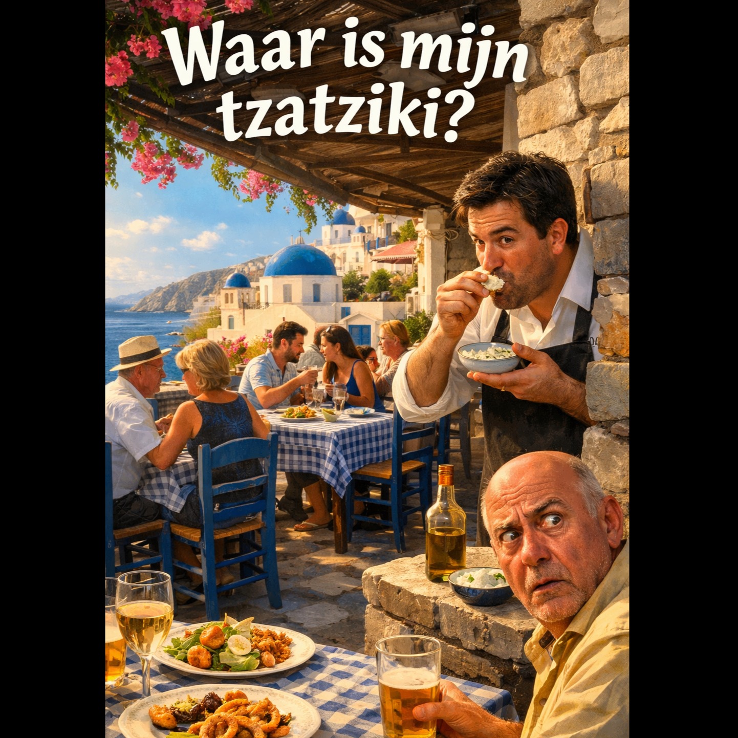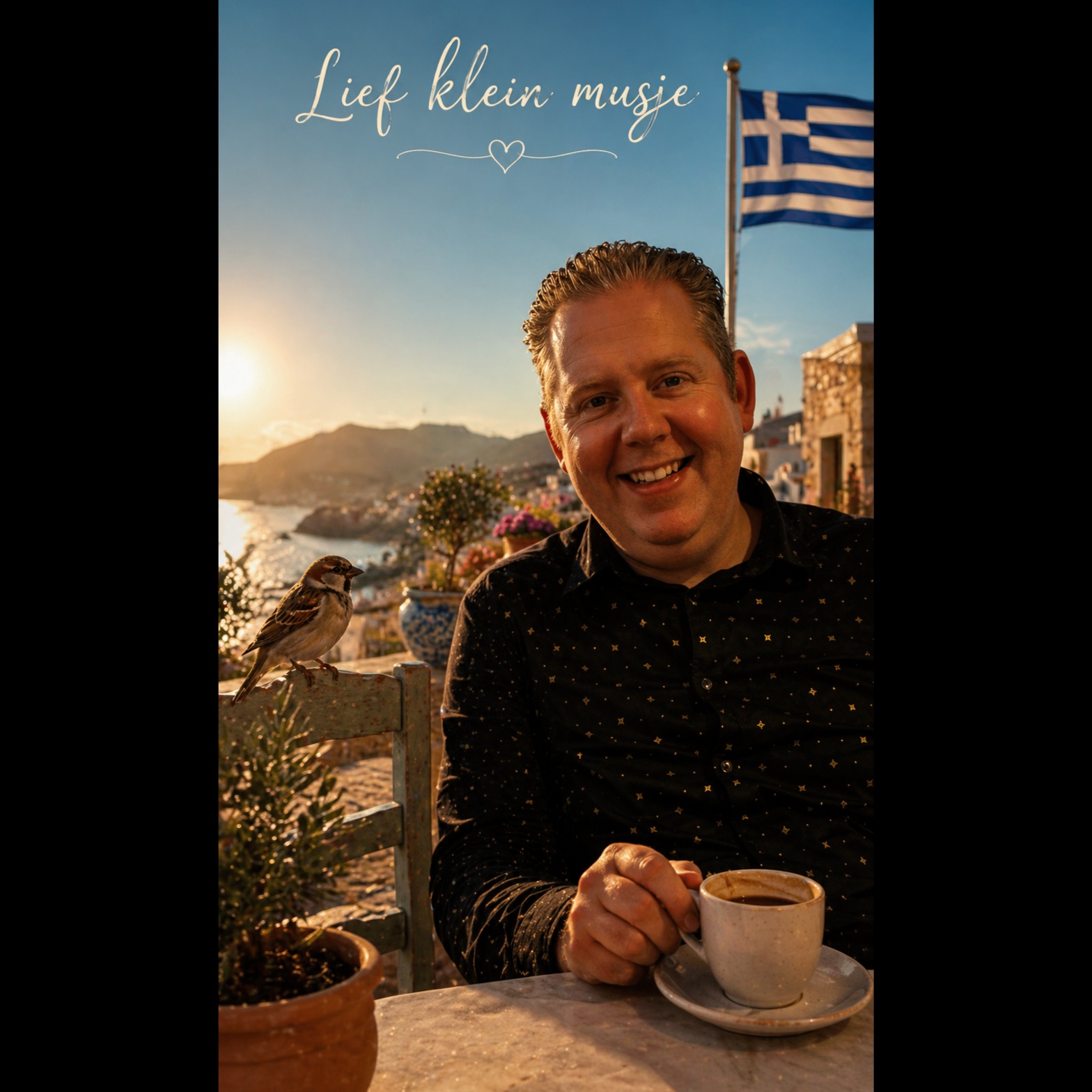 Greek folk ballad with light sirtaki influence, bouzouki-led melody, gradual gentle rhythm, slow to mid tempo (80-95 bpm), male vocal, expressive but soft tone, warm Mediterranean evening atmosphere, acoustic guitar, bouzouki, light hand percussion, subtle claps, relaxed taverna terrace vibe, romantic and peaceful mood, storytelling style, slightly playful undertone, clean mix with natural ambience