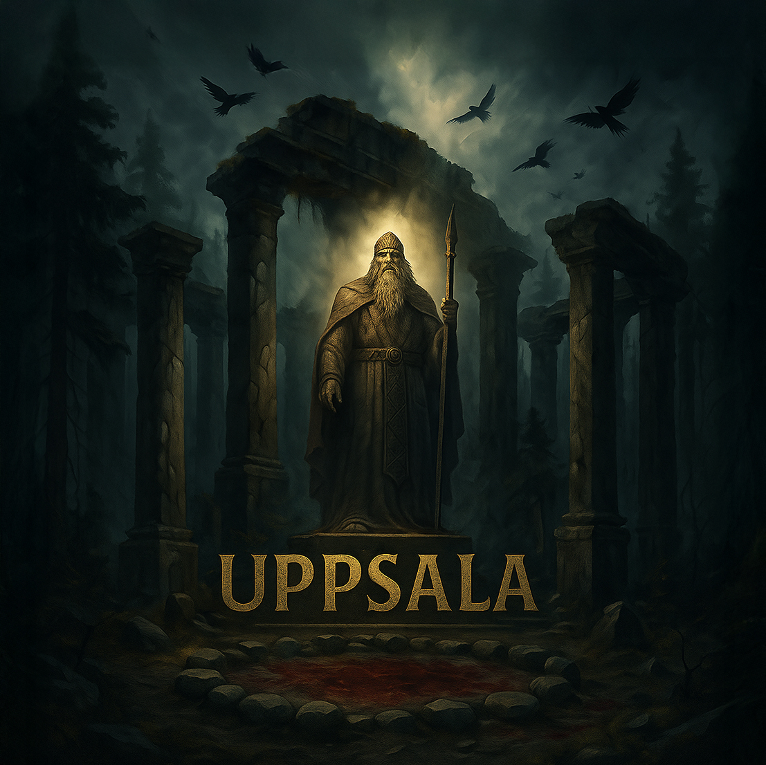 Epic Norse ritual music with a dark, cinematic atmosphere, Deep male Viking choir chanting in Old Norse, layered over slow war drums, resonant horns, tagelharpa and ambient strings, Mood is sacred, solemn, powerful — evoking ancient ceremonies at Uppsala temple, Include atmospheric elements like fire crackling, distant thunder, echoing wind, and occasional low throat singing, Music should feel like a blood offering under the northern sky, invoking gods and fate, Tempo: slow to mid, with heavy rhythmic pulse and ethereal textures, Style blend of dark Nordic folk, ritual ambient, and historical fantasy soundtrack