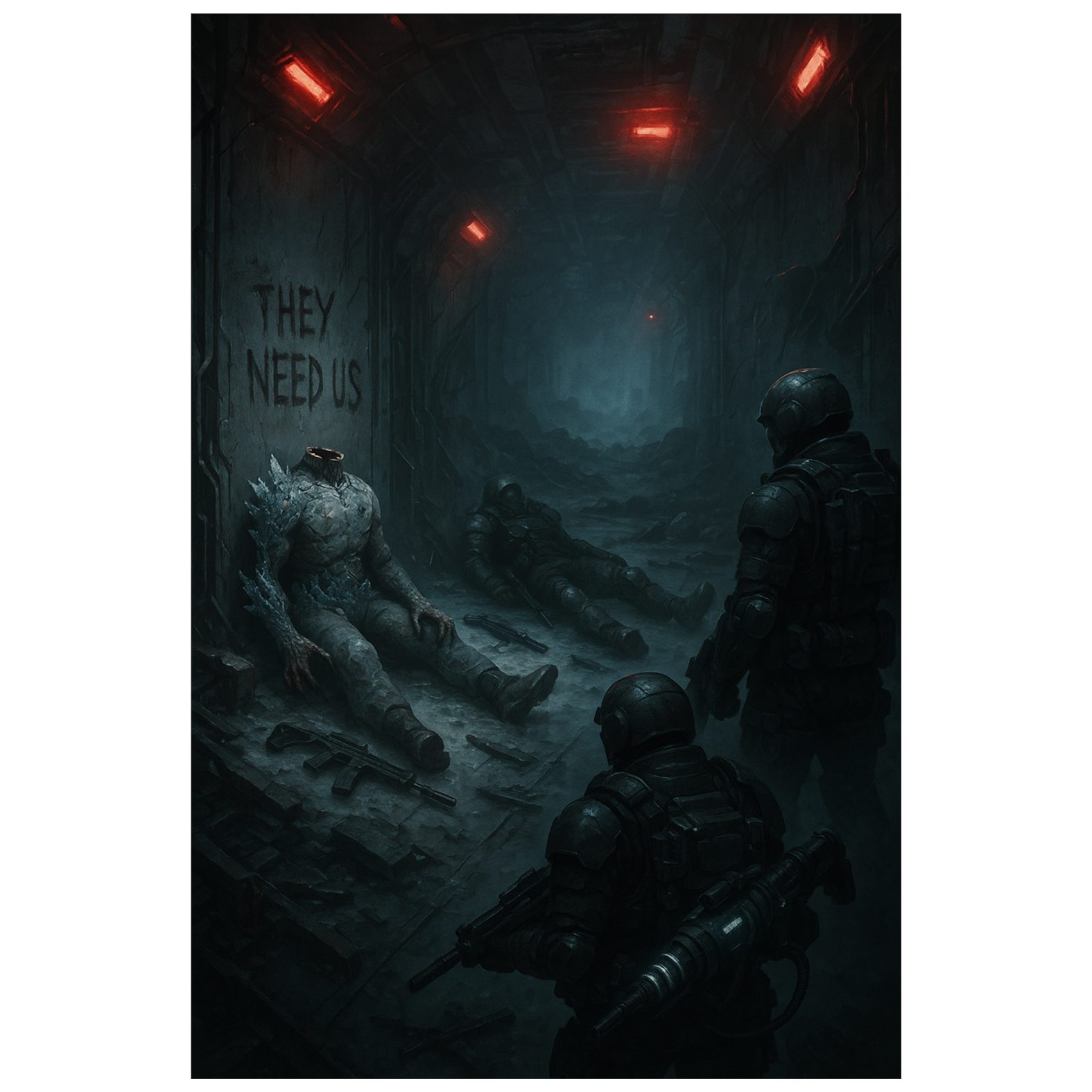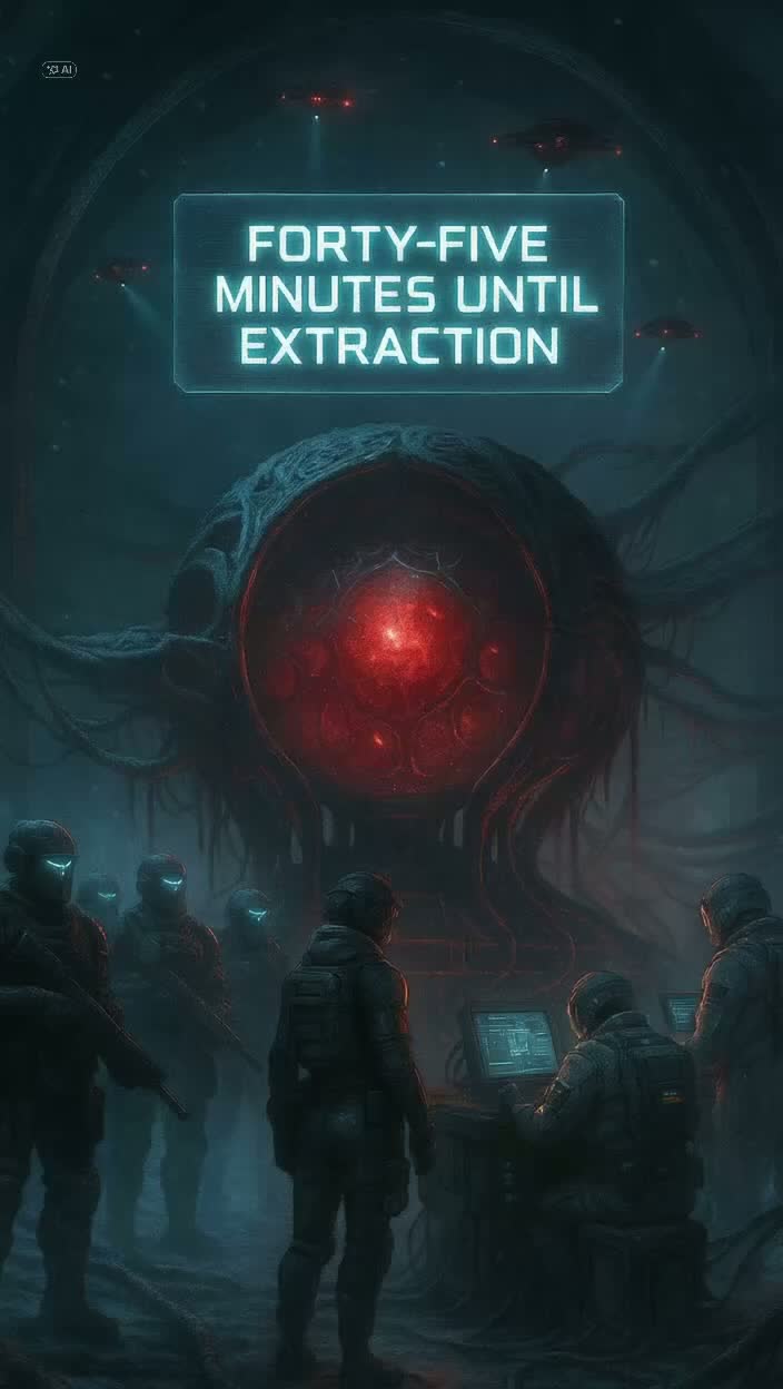 Hybrid sci-fi horror track with cinematic ambient structure, spoken audio logs, dark instrumental buildup, and a single alien-style chorus, Voices are clearly defined: filtered log speaker (baritone), urgent scientist (mezzo), commanding officer (female baritone), and distorted alien-hybrid voice for Roth, Chorus is sung once in a reverberated alien choir tone with unnatural harmonies, All spoken parts are underscored by rhythmic background music, Instruments include cold synthpads, reversed percussive FX, growling drones, glitch pulses, heartbeat motifs, and wet body mutation sounds, Combat section uses sharp riflefire FX, armor crashes, and distant screams (not generic), Tension rises through two instrumental bridges with distortion surges and cinematic synths, Final outro spoken only with fading drone and heartbeat stop, Total duration: ~3:00, Use cinematic pacing, alien voice FX, and heavy ambient textures, Avoid pop or vocal styling