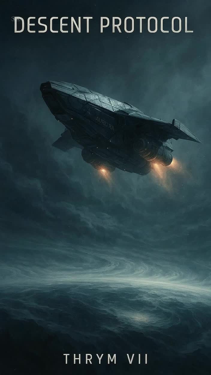 Epic cinematic sci-fi soundtrack with strong melodic presence and rich instrumental textures, The music should reflect a dramatic descent through a hostile alien atmosphere, combining deep orchestral strings, dark synthetic textures, rising tension motifs and emotional harmonic layers, Include dynamic percussion elements, rhythmic pulses, and a memorable main melody, The overall tone should feel like a mix of Star Trek, Transformers, and Dead Space – epic but ominous, At 0:30, a spoken baritone voice (Commander Wagner) delivers a cockpit log with radio static and filtered distortion, Then insert a powerful instrumental bridge (70–90 seconds) with rising intensity, melodic progression, and no vocals, Near 2:40, bring in the second spoken line: “Touchdown confirmed, Aurora has landed, ” Finish with a resolved chord or subtle impact tone, Target length: 3:00–3:30 min, No singing or melodic vocals – just immersive music and spoken voice, ‑lo-fi, ‑upbeat, ‑EDM, ‑funk-pop, ‑acoustic, ‑happy vocals, ‑hip-hop, ‑tropical, ‑minimal drones