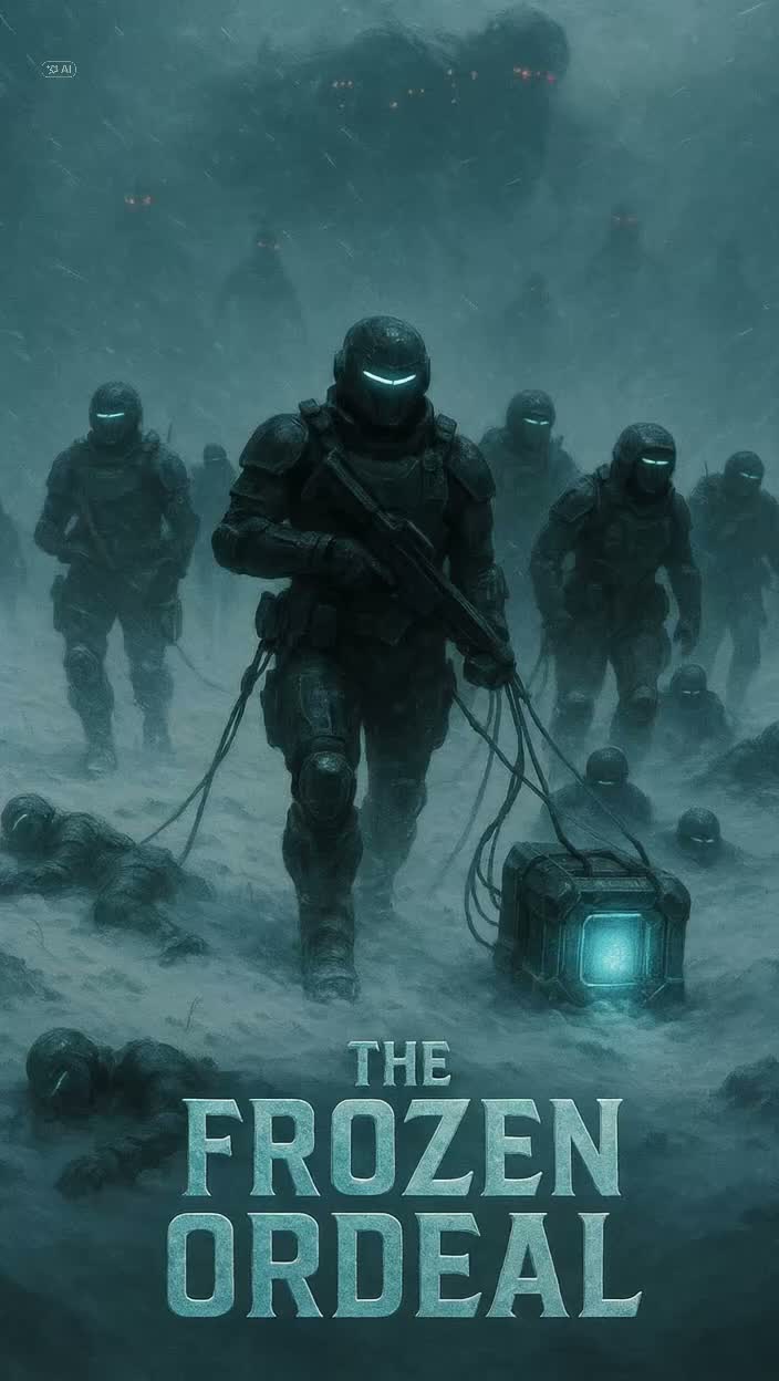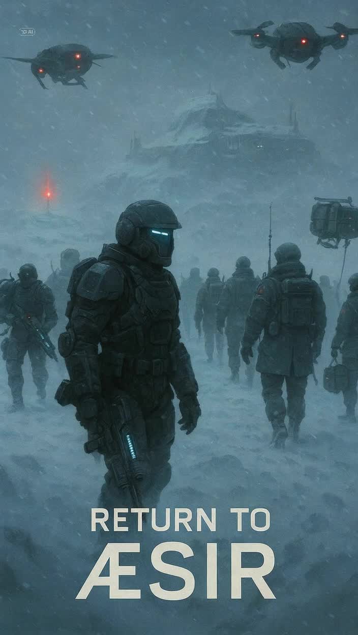 Military sci-fi soundtrack with disciplined rhythm, cinematic tension, and no vocals, Do not generate singing, melodies with lyrics, or interpret spoken lines musically, Start with a short ambient intro, then move into a structured 4/4 march rhythm with clear tempo and layered instrumentation, Percussion should be firm: military snares, low toms, and deep pulses, Melody must be present early and stay consistent – solemn, memorable, emotionally restrained, Use cold orchestral textures: low strings, synth brass, synthetic bass, Add subtle sci-fi elements: reactor hum, icy wind, snow impact, Instrumental sections must remain clear, compact, and cinematic – never floating, ambient, or mystical, Alternate precisely between spoken voice logs and music, All voices are spoken only – male and female must stay distinct and never blend, Total runtime should remain under control and follow narrative pacing, No vocals, no melody singing, no vocal blending