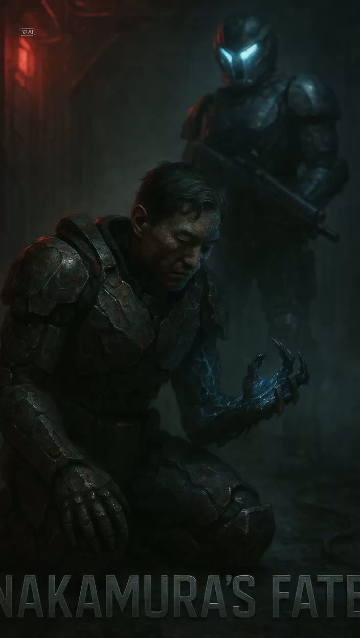 Cinematic sci-fi horror track with strong rhythm and a memorable recurring motif, Music starts immediately under the first spoken log – no silent intro, Use deep Taiko drums and heavy industrial percussion for pulse and drive, Layer metallic impacts, hydraulic hisses, and machine hums to create the feel of an ancient lab, Add dark orchestral elements: bass clarinet, viola, and low horns for melodic motifs, high strings for sharp tension, Occasional male drone choir as background texture, Keep rhythm steady and suspenseful, not too slow, driving the spoken parts forward, Instrumental bridges should build with layered percussion, rising horns, and echoes of distant drones transmitting static and faint battle sounds, Final bridge hymn-like but ominous, then music drops back for Nakamura’s broken voice, Outro purely instrumental, low bass heartbeat fading with metallic resonance, Maintain balance between industrial and orchestral