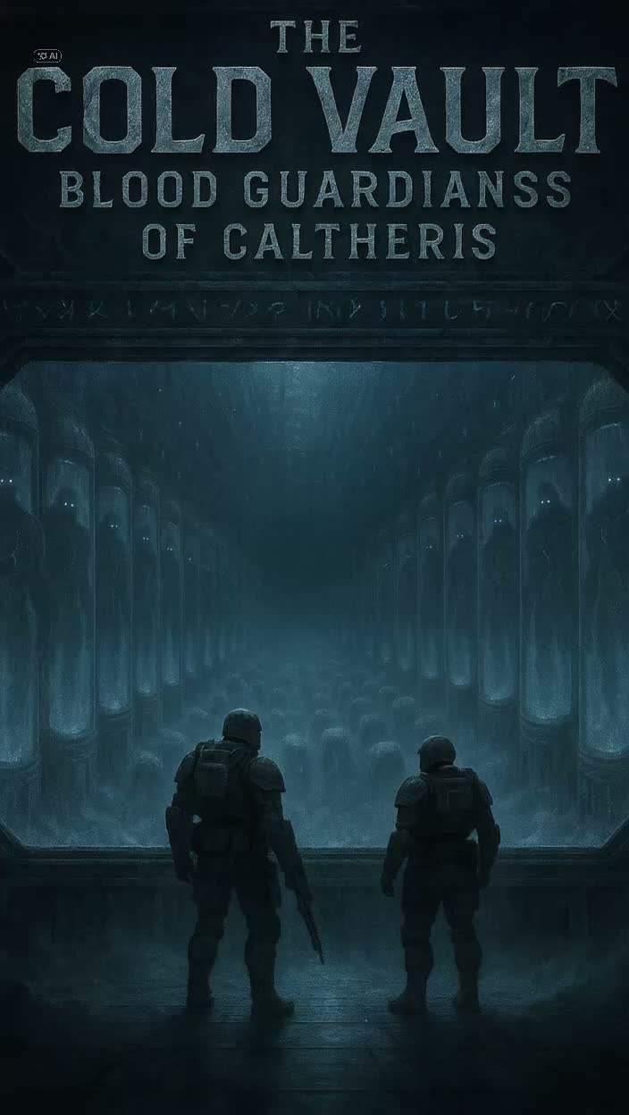 Military sci-fi ambient-horror track inspired by late-70s atmospheric science-fiction scores, Spoken text and music must start simultaneously with no long intro, Cold, minimalist tension with deep string drones, low mechanical hum, and a recurring 4–6 note cello leitmotif in minor, Leitmotif must repeat across the track in varied instrumentation (cello, horn, celesta) to unify scenes without monotony, Include metallic drips, distant echoes, faint steam vents, Scene 1: Cold Vault entry – Taggert speaks over background music with leitmotif already present, Scene 2: Archive computer – female synthetic clinical voice with slight echo, reveals CALTHERIS = Blood Guardians, elite liquidators confined in stasis, Scene 3: Taggert horrified, describing hundreds in stasis, Scene 4: Aurora distress call – urgent female voice, dramatic with static, alarms, gunfire, and interruptions, End with dissonant leitmotif variation, heartbeat percussion crescendo, abrupt silence
