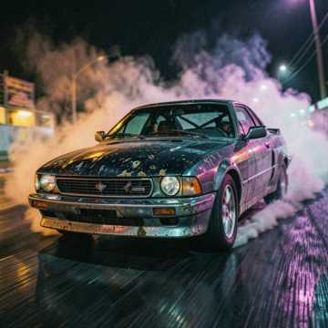 gabber, rally, juke, 2step, phonk house, rally house, detuned 808 slides, cowbell syncopation, rubbery sub-bass, distorted kick layering, brake-squeal sample chops, engine rev percussion, gated snare snaps, radio static filters, tape wobble, sidechain pumping, breakneck momentum, asphalt grit, 142 BPM, swung halftime groove, chopped vocal stabs