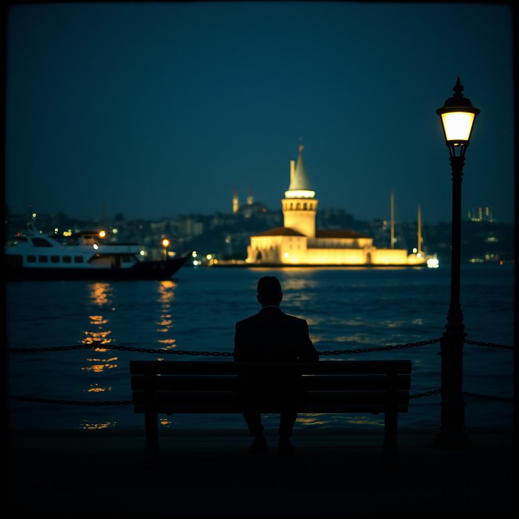Turkish Alternative Rock / Indie Rock, melancholic and introspective mood, band-driven arrangement, male vocals with restrained and emotional delivery (not whispered), natural and dry close vocal, clean electric guitars with subtle overdrive, arpeggiated guitar patterns, live acoustic drum kit (soft but present), bass guitar following root notes, minimal effects, room reverb instead of spacious reverb, mid-slow tempo (90–100 BPM), minor key, night-time urban atmosphere, emotional tension, understated dynamics, quiet verses and slightly lifted choruses, intimate but grounded, realistic band sound