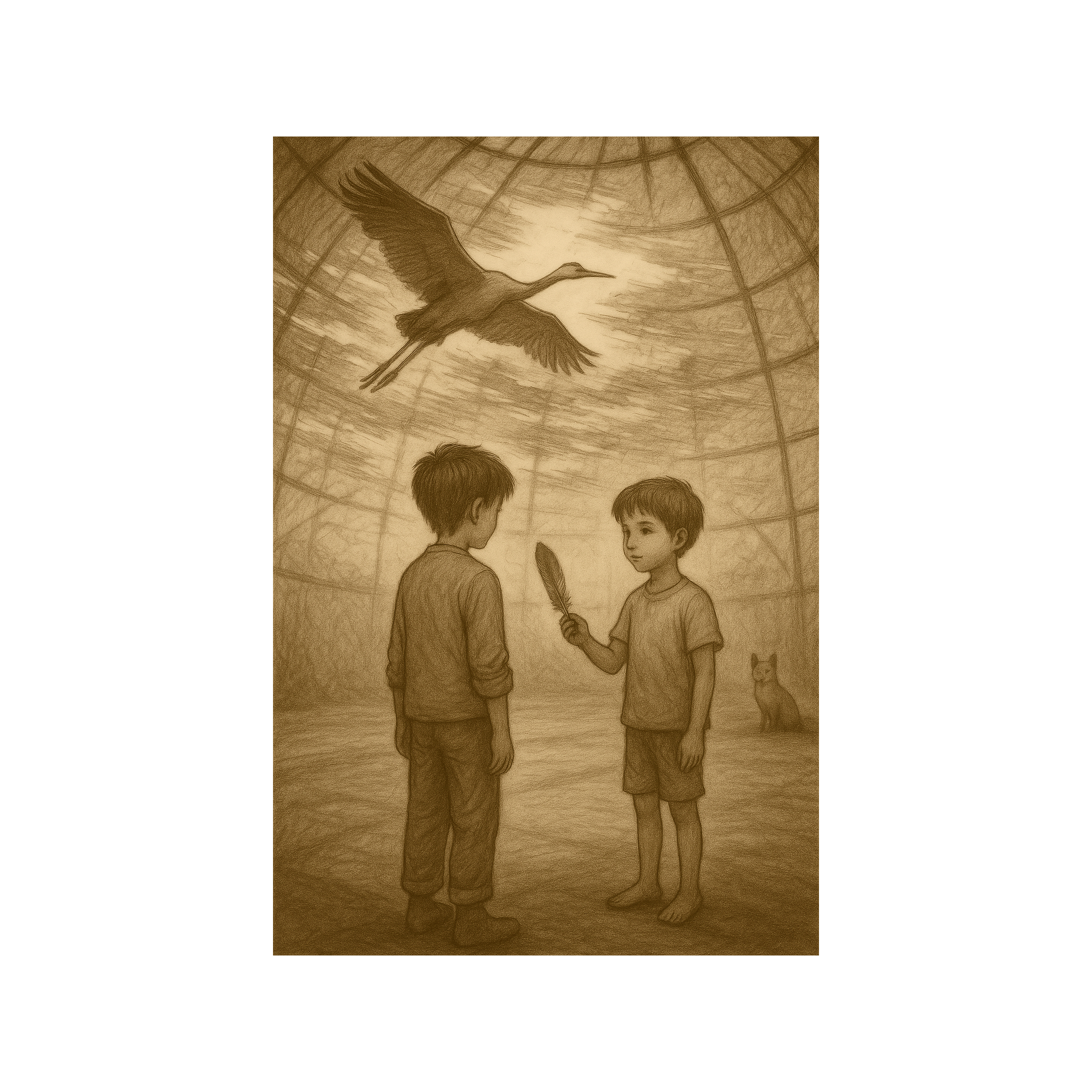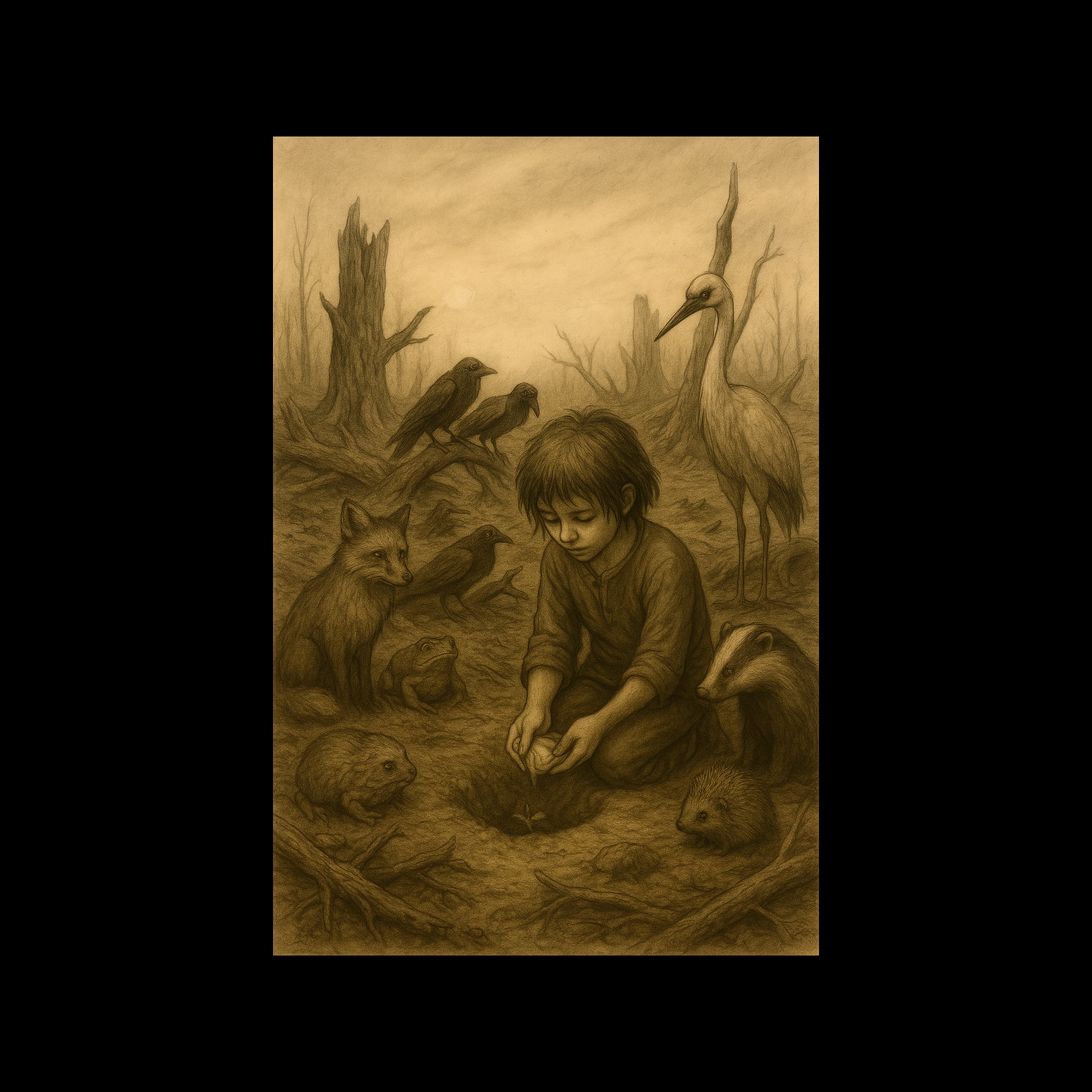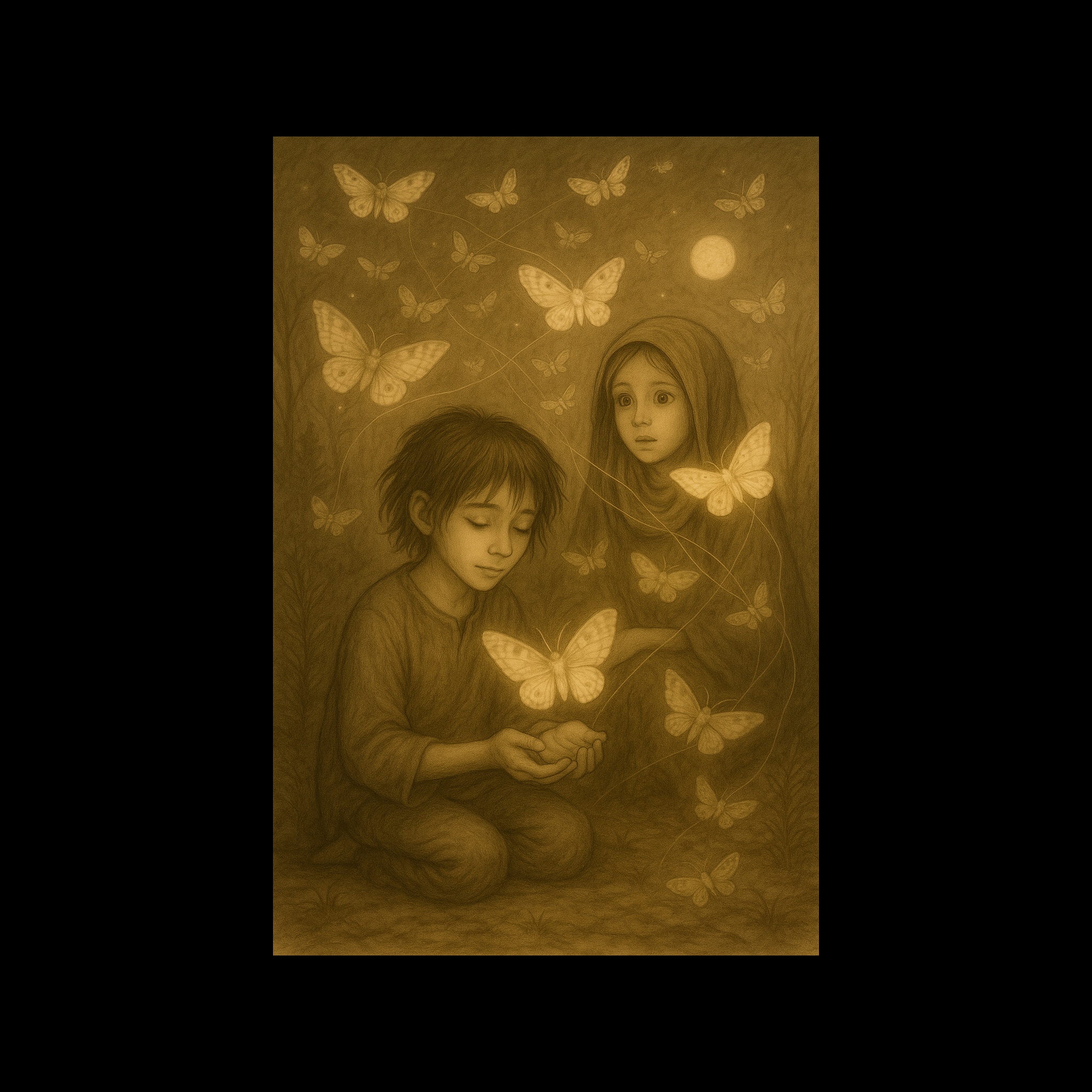 distant childlike voices, faint wind and birds, melancholic, ambient, dreamy, faint, soft piano, gentle strings, gentle, soft, electronic