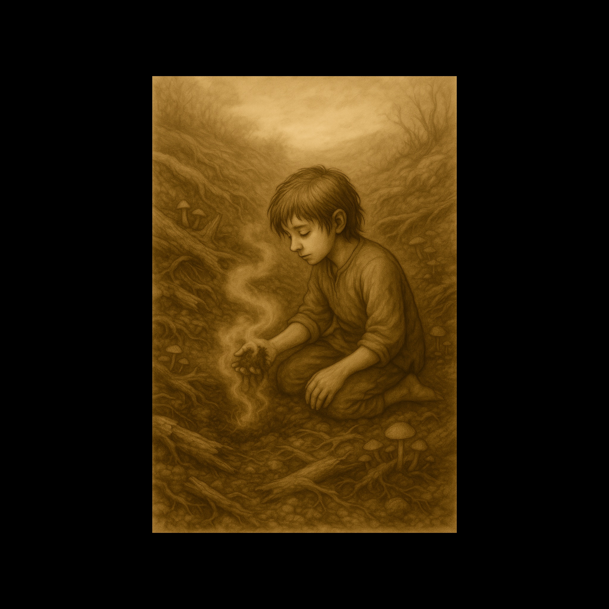 slow, slow string layers, tone, earthy and spacious, ambient, gentle, crackling fire sounds, gentle pulsing, soft, soft drones, melancholic tone, instrumental, emotional