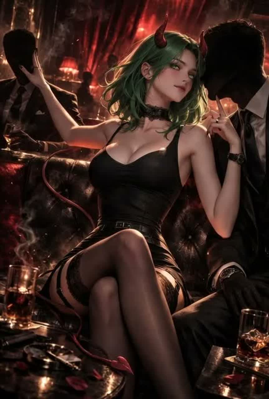 A modern gothic glam metal track blending overdriven guitars, swaggering halftime grooves, and vampiric walking basslines, Sleazy swing drums and sinister carnival organ flourishes evoke a dark cabaret spectacle, Female lead vocals deliver theatrical, confident lines, joined by gang shouts on the hooks, Verses smolder with restrained groove before bursting into double-time chant-along choruses, Between lines, squealing guitar fills snarl like demons behind velvet curtains, The bridge collapses into a reverb-drenched breakdown, then explodes into a higher-key final chorus, The sound is lavish, gothic, and unapologetically over-the-top — a cathedral built for excess