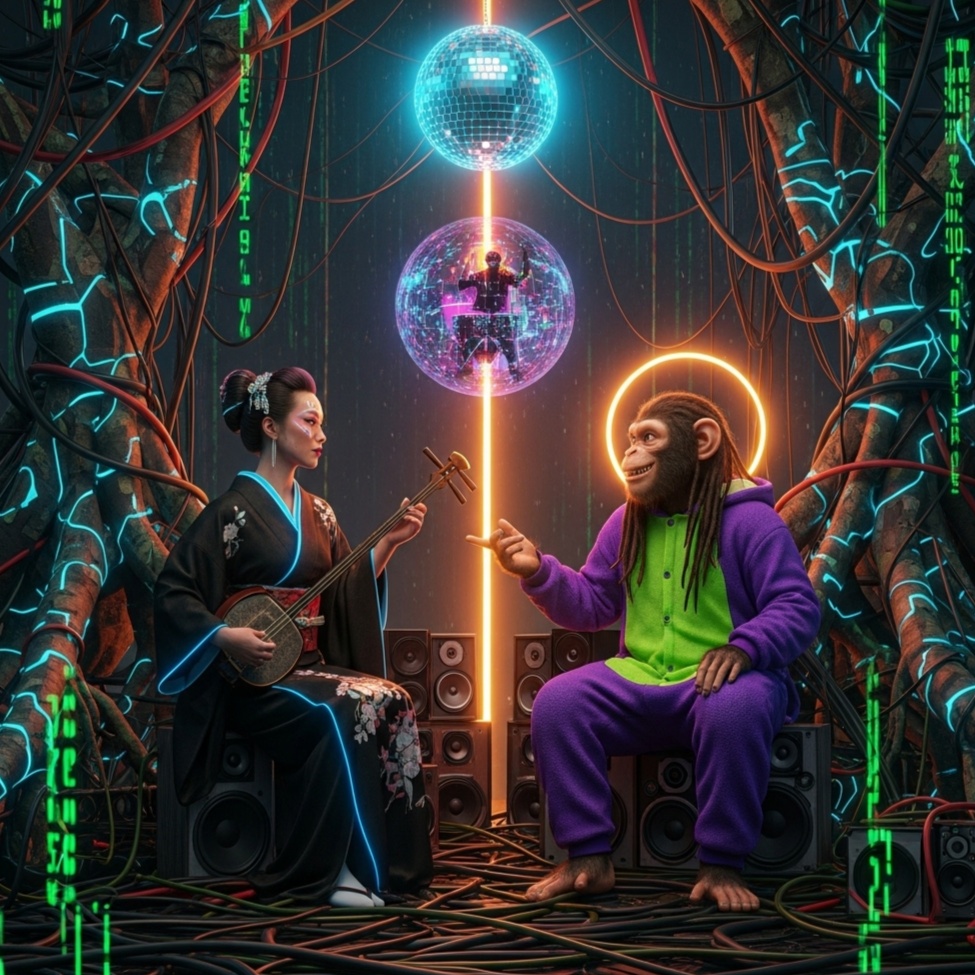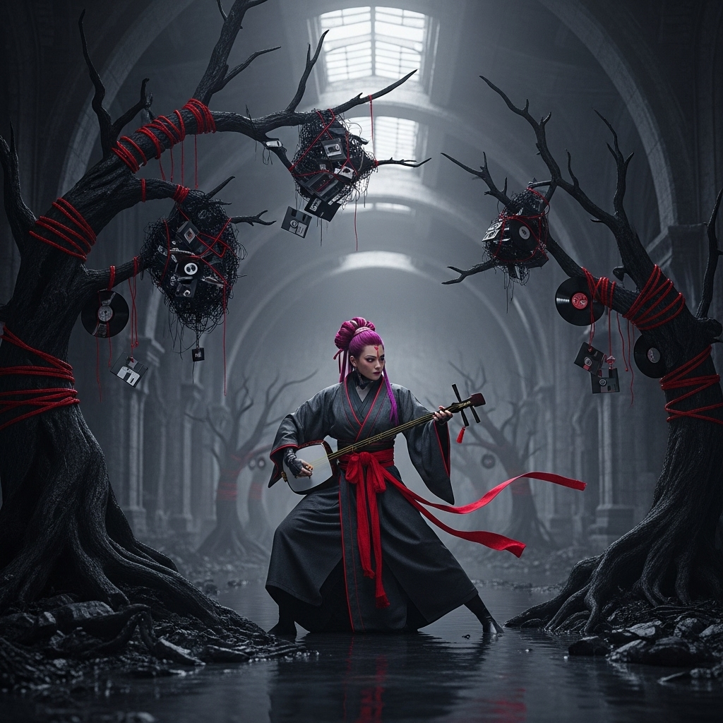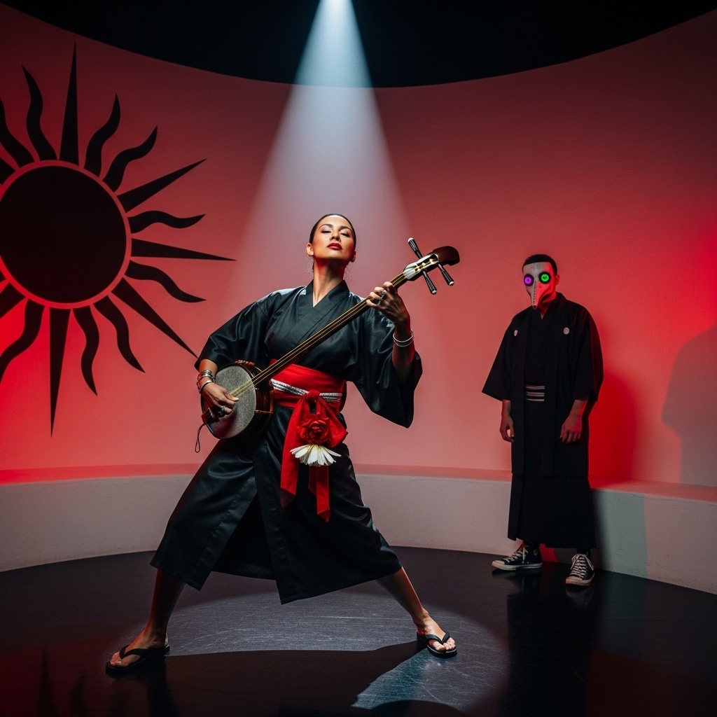 [Music: The lead instrument is a Shamisen, played with the lightning-fast, intricate fingerpicking of a bluegrass banjo, The entire rhythm is created by a powerful, percussive Tap Dancing section and punctuated by the guttural, rhythmic chants of a modern Kabuki choir, A low, tense synth drone provides a haunting atmosphere, ]