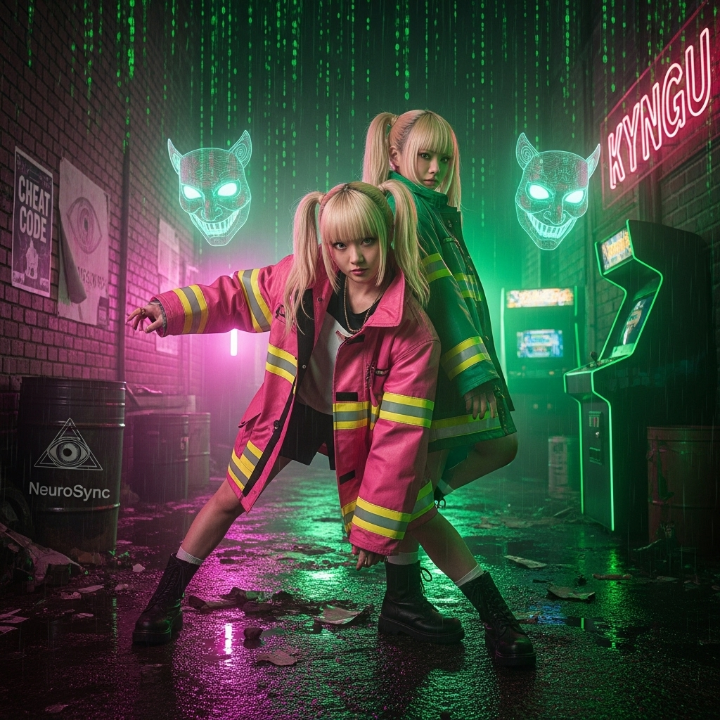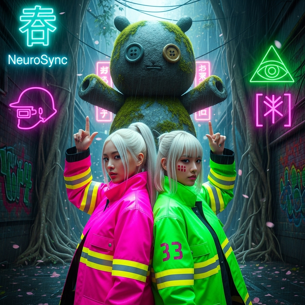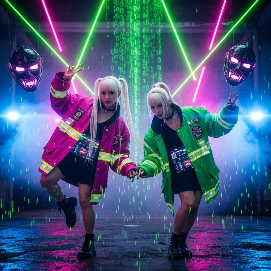 [Style: 80s Kawaii City Pop, Viral TikTok Dance, Brutal Industrial Metal, Ritualistic Glitchcore, Female Duet with sweet-to-demonic vocal shift, Catchy Synth Hook, Heavy Funk Bassline, Japanese Language]