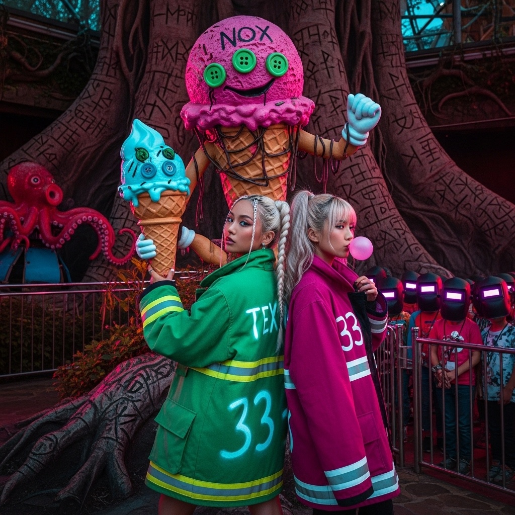 [Style: J-Pop/Idol Metal, Industrial Funk, Eurodance, Lead Female Vox: Twin high-pitched, sweet, robotic, "kawaii" vocals that shift to taunting and demonic during breakdowns, Second Male Vox (NHC): Cool, detached alt-pop ad-libs and whispers, Music features a four-on-the-floor viral dance beat, incredibly simple and catchy synth hooks, and a virtuosic, percussive slap-bass, This contrasts with sudden, explosive breakdowns into heavy, downtuned industrial metal with brutal guitar riffs, The overall mood is a sinister fusion of a children's song, a global dance craze, and a cosmic horror story, Incredibly danceable, fun, and commercial, with a deeply disturbing and sinister core, ]