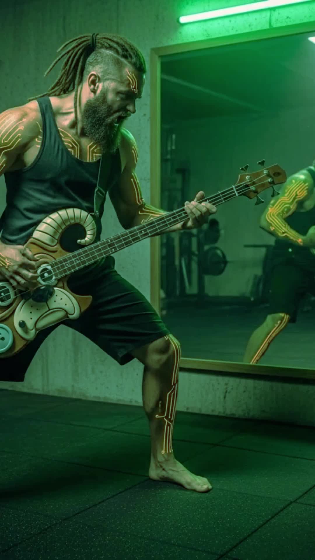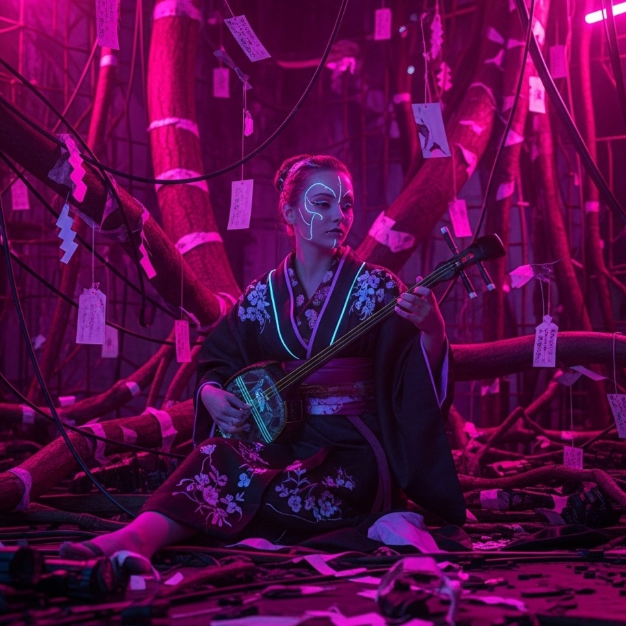 [Music Style: A unique fusion of Surf Rock, Cloud Rap, and smooth Jazz, with a powerful, distorted Shamisen as a lead instrument, The track features traditional and retro-futuristic Japanese percussion (taiko drums, tsuzumi, glitchy pads), The mood is a complex blend of melancholic longing, dreamy introspection, and explosive, rebellious energy, ]