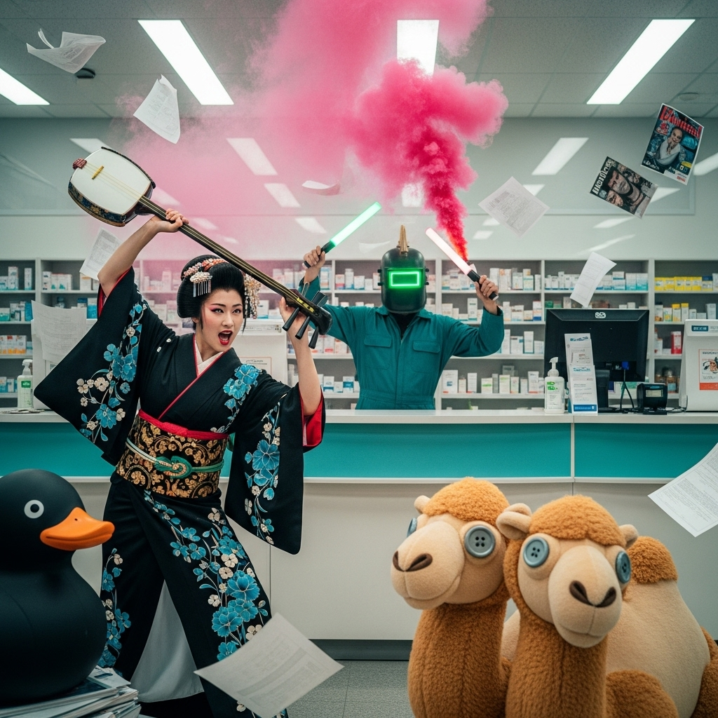 [Okinawa Rave Funk fused with Bunggie Nu-Metal and Kawaii Punk, Fast Tempo 185 BPM, Aggressive Slap Shamisen riffs mixed with Heavy funk Distorted Guitars, Frenetic Gabber Drums, "Emi nem" style comedic Rap flow switching instantly to Death Metal Screams (Growls), High-pitched J-Pop Vocals (Moe style) vs Demonic Shouts, Sound of Anime Explosions and 8-bit coins, Gang Vocals, Absurdist, Chaotic, Viral J-Core]
