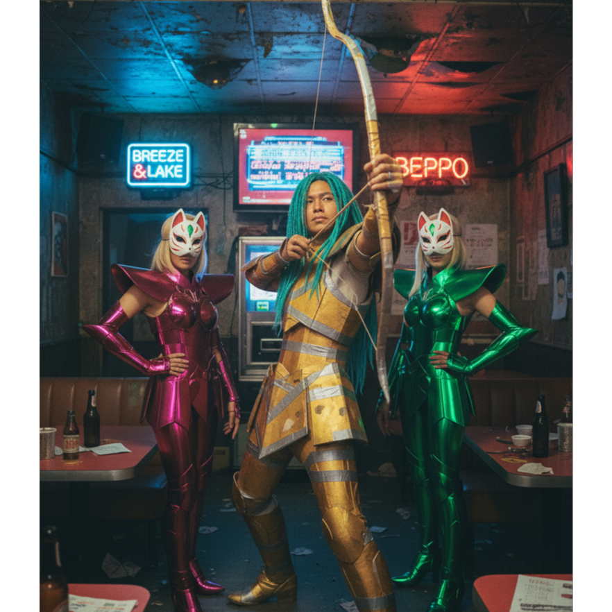 [Music Style: Tengu Glitch Cumbia, Yakuza Kawaii Bass, Future Idol Ritual Pop, Japanese Language, Female Duet Vocals, Catchy, Danceable, Manic, Cyberpunk, Japanese Schoolgirl Punk-Funk, Eccentric Pop, Brass-infused J-Rock style, Kamen Rider theme influence]
