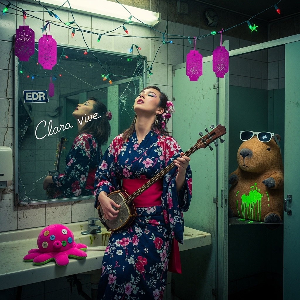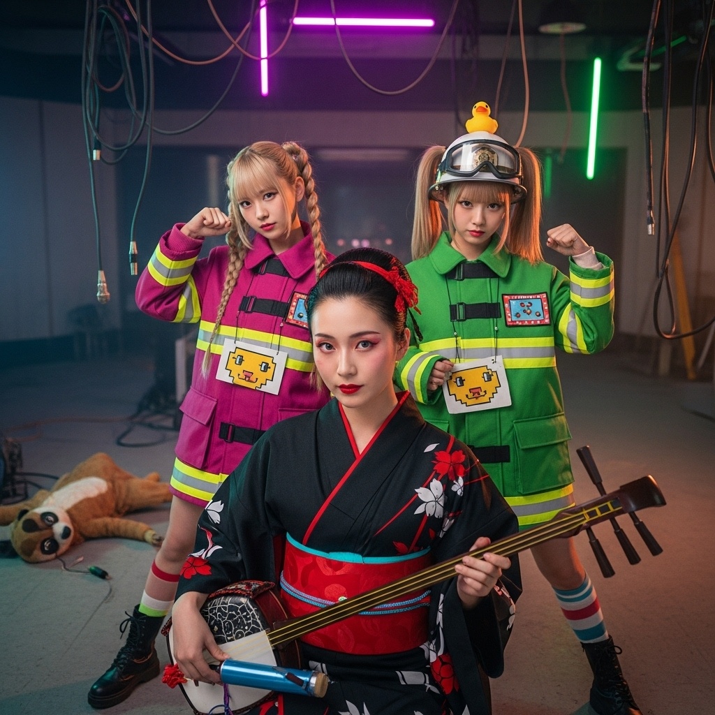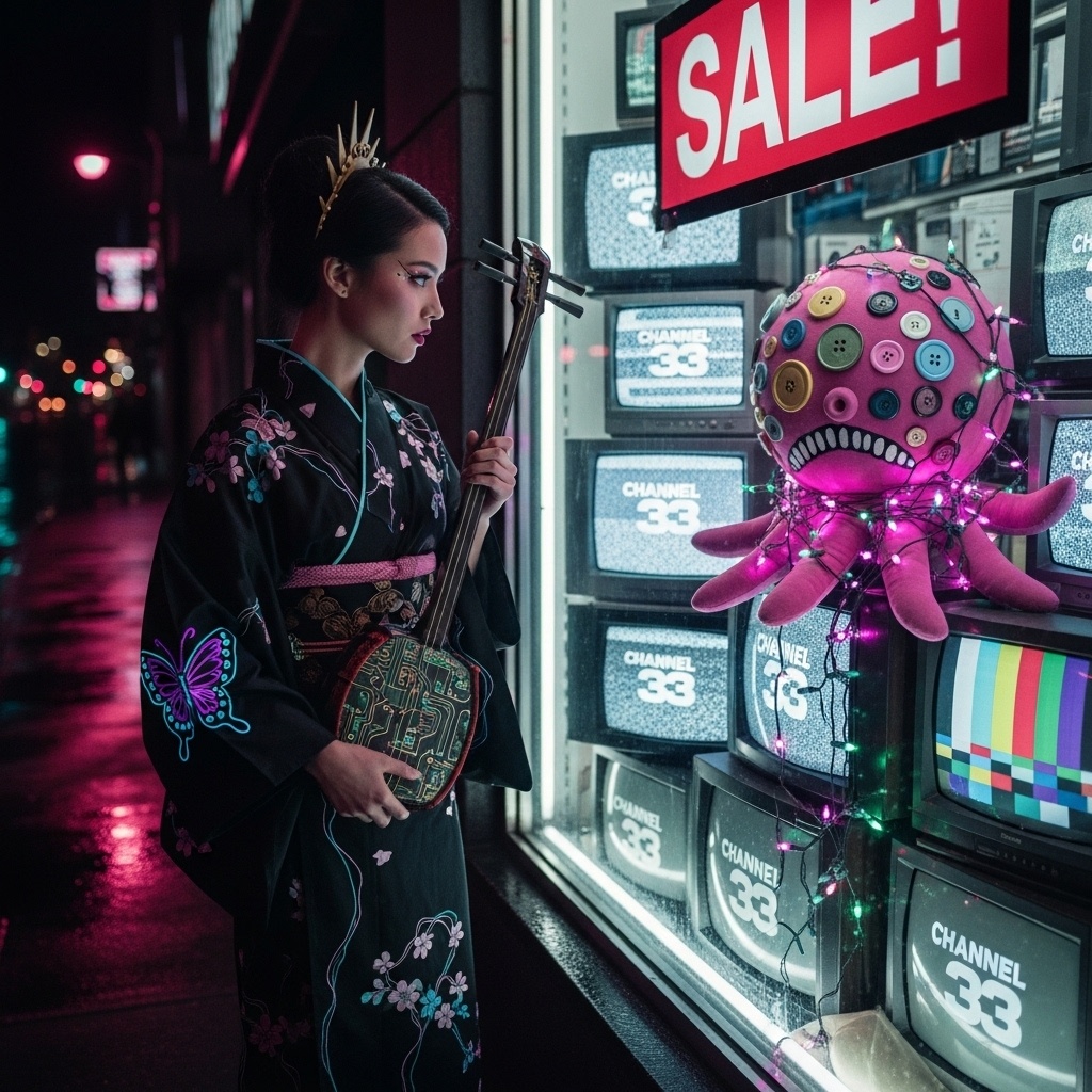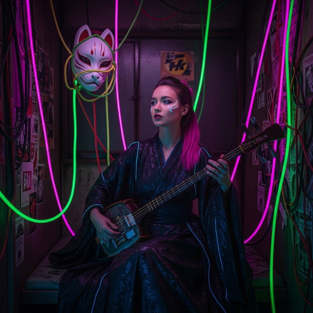 [Music Style: 80s Japanese City Pop, sophisticated Funk, inspired by Mariya Takeuchi's "Plastic Love", With sudden, explosive shifts into powerful Glam Rock and raw Yakuza-Punk, Features a hypnotic, atmospheric spoken-word bridge (Lana Del Rey/Madonna), Lead Female Vox shifts from sweet J-Pop to a powerful rock belt and punk snarls, Features a virtuosic electric SHAMISEN (playing groovy city-pop lines, then exploding with Foo Fighters-esque power chords and Primus-esque slap techniques), EDR's signature retro-tech industrial DRUMS provide the chaotic, tribal, and glitched-out heartbeat, ]